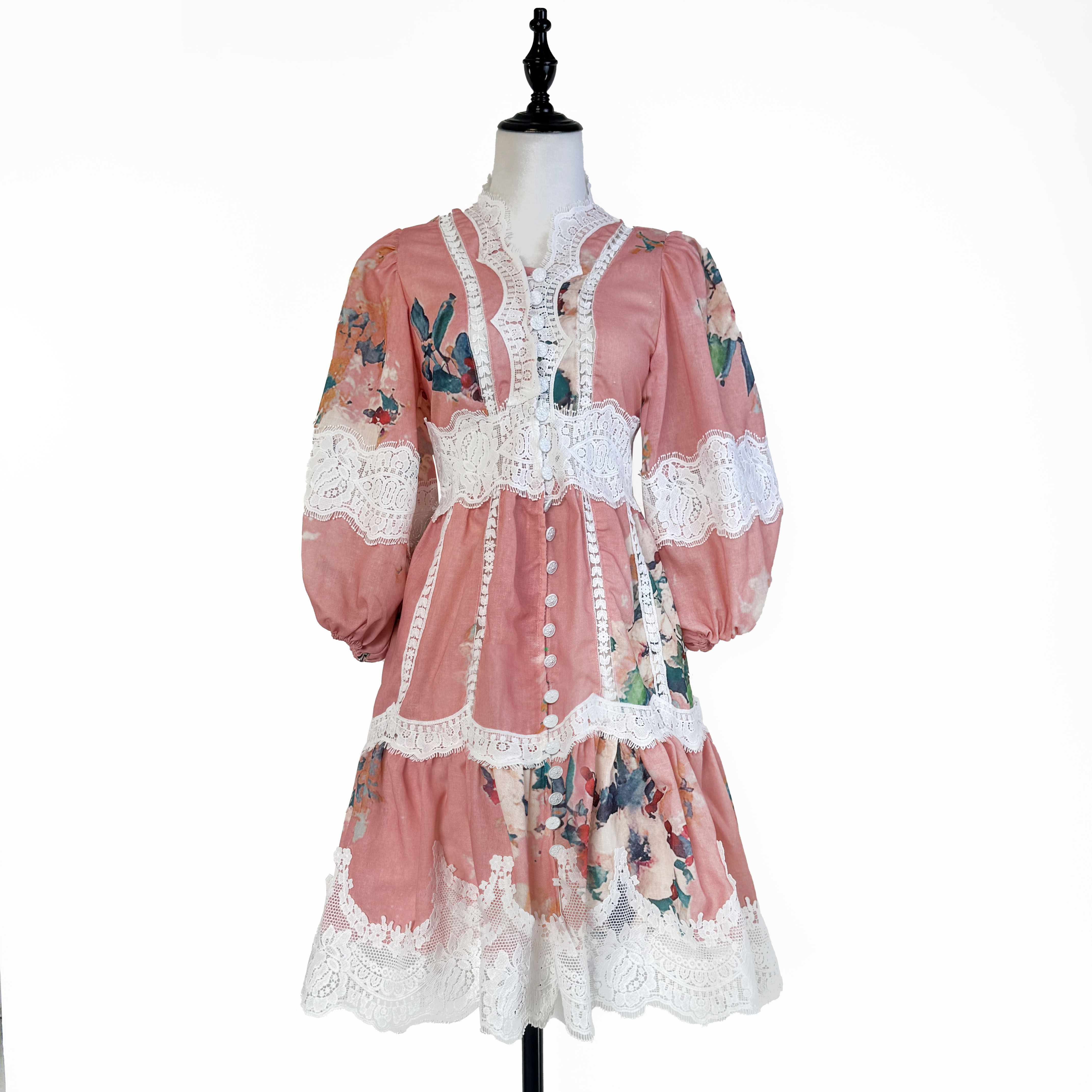 Realistic design sense: V-neck heavy industry splicing lace lace lantern sleeves, single breasted dress, waist cinching short skirt