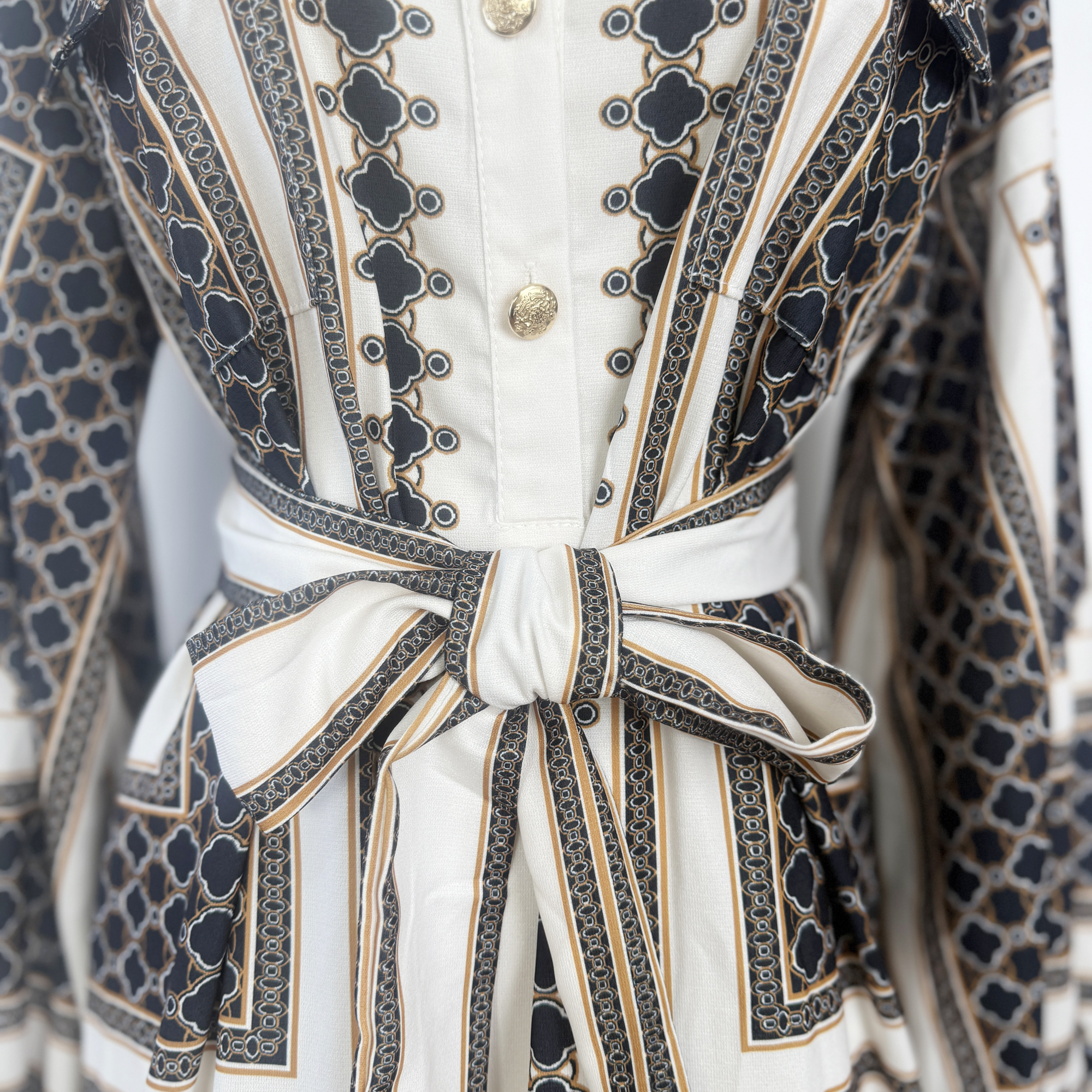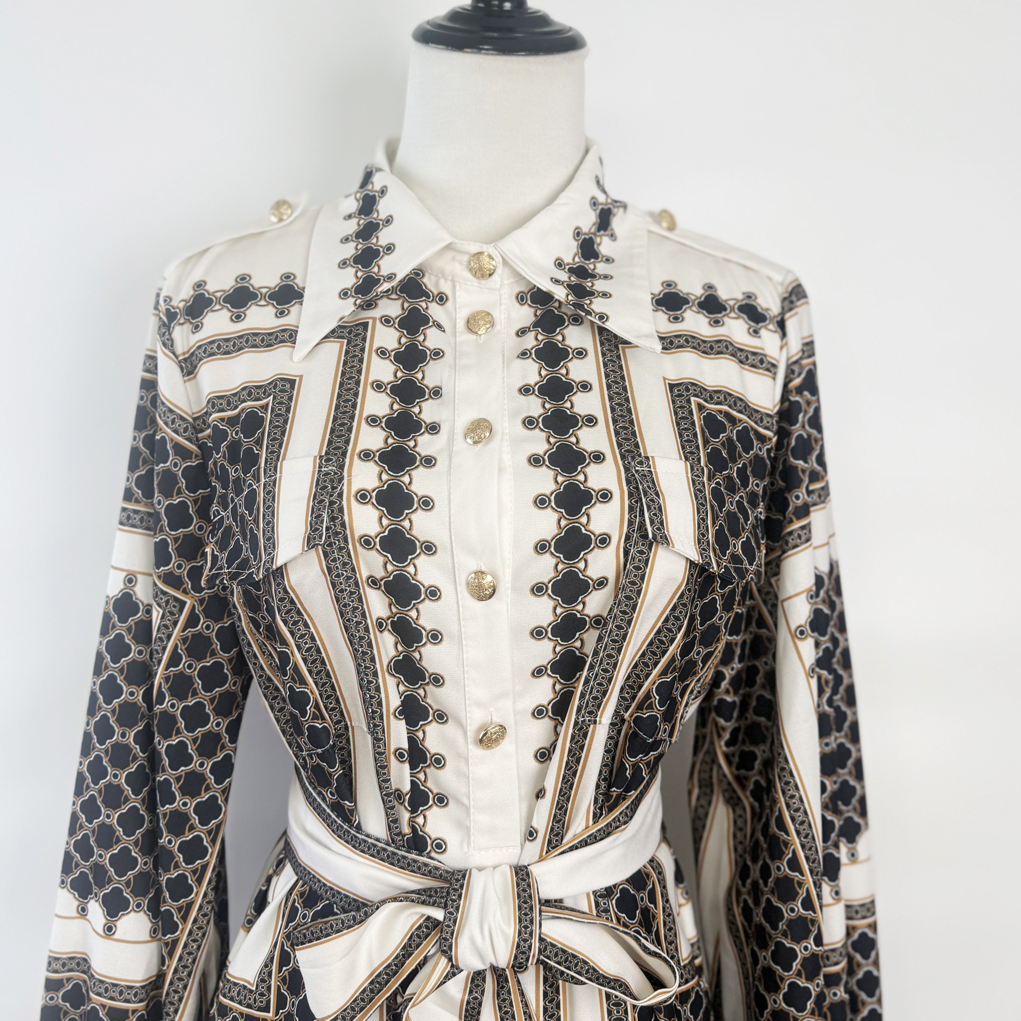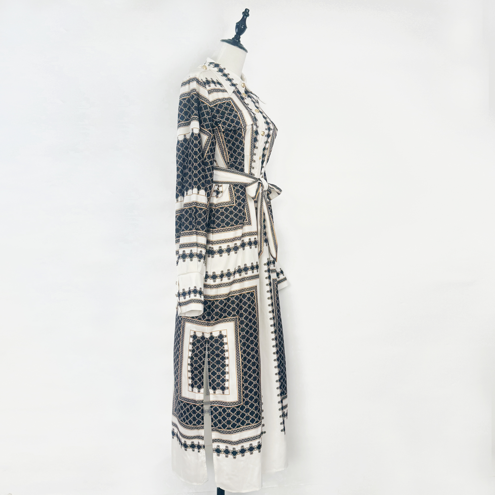 Real time shooting of light luxury high-end 2025 autumn new item, black geometric printed pattern, silk scarf printed dress, shirt skirt
