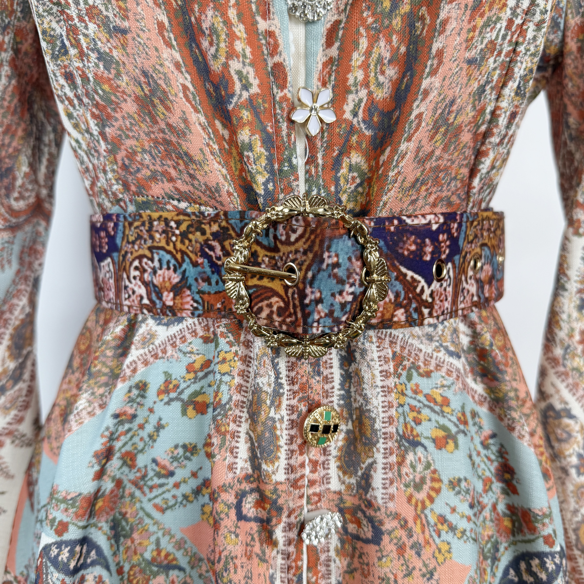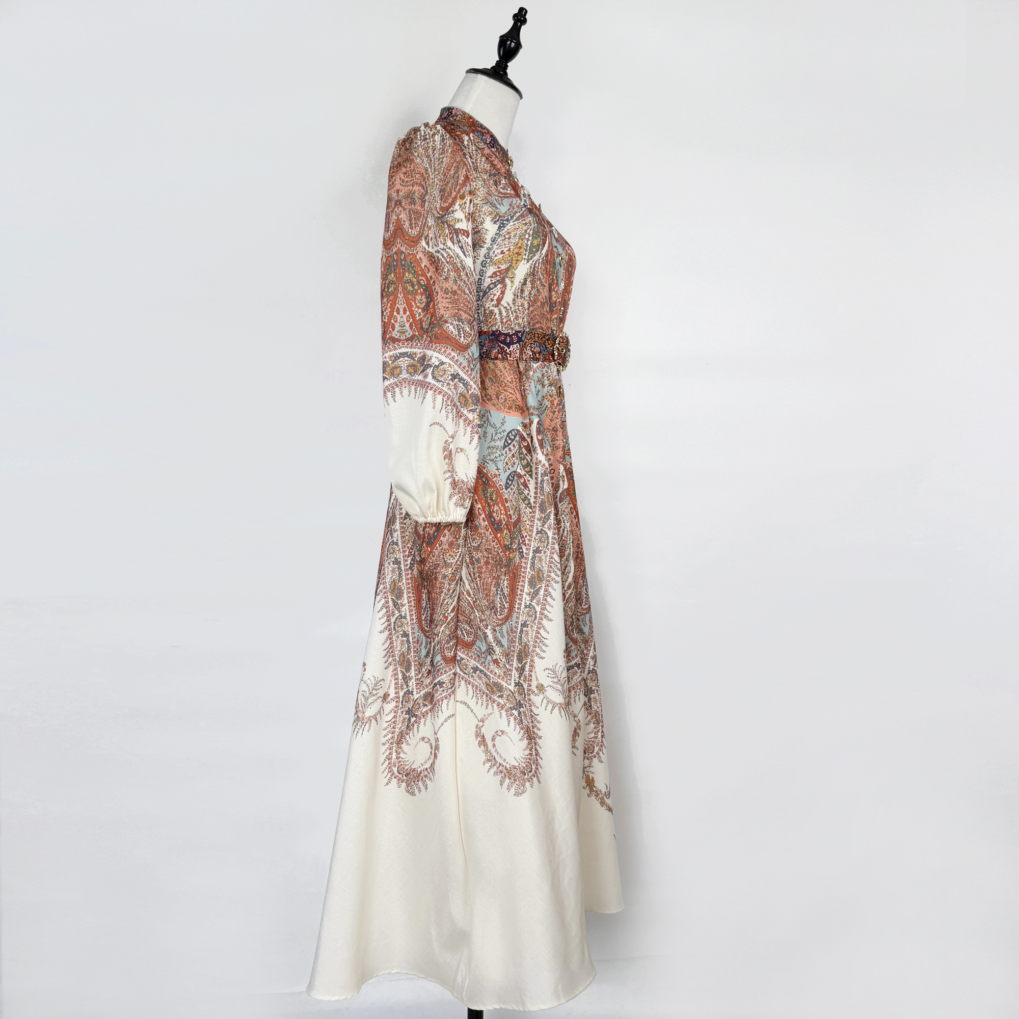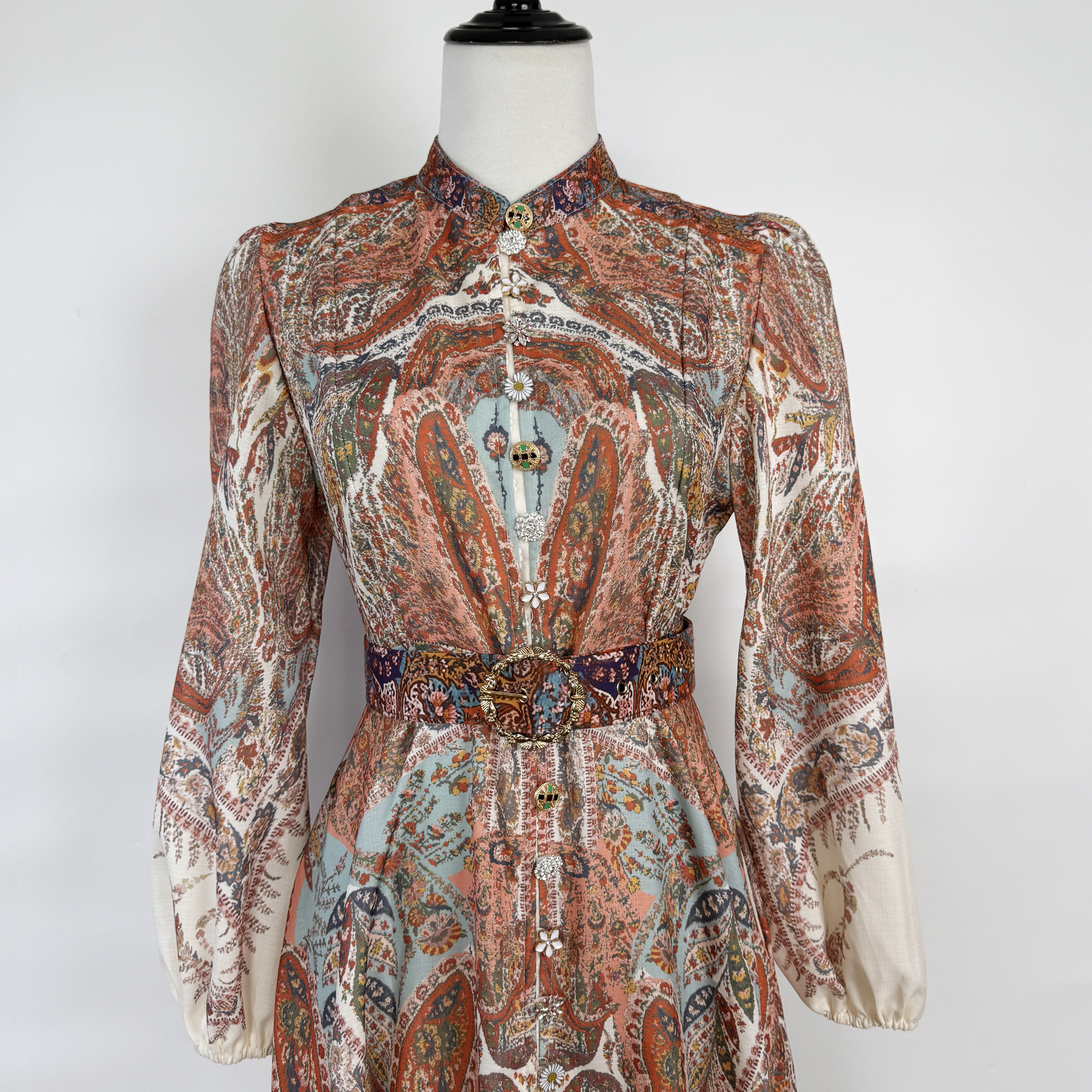 Real shot Australian new retro positioning printed stand up collar lantern sleeves single breasted mid length dress+belt