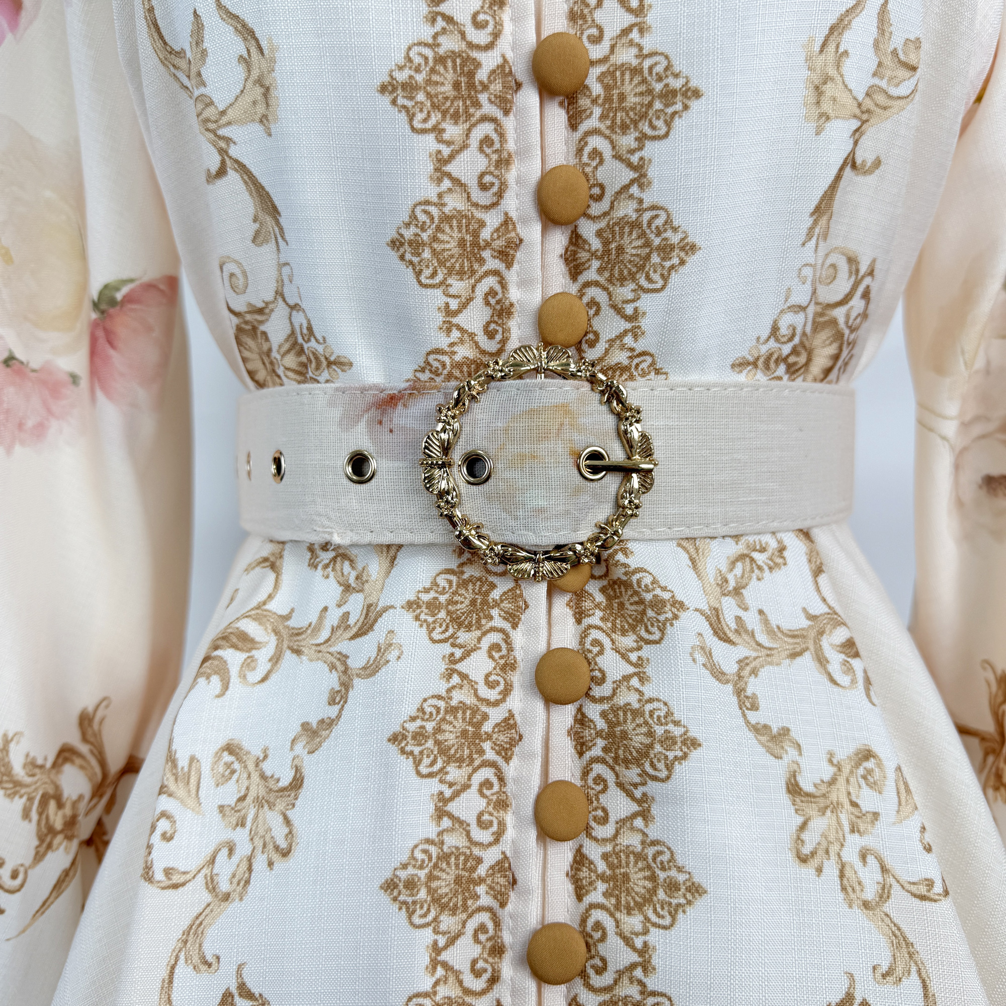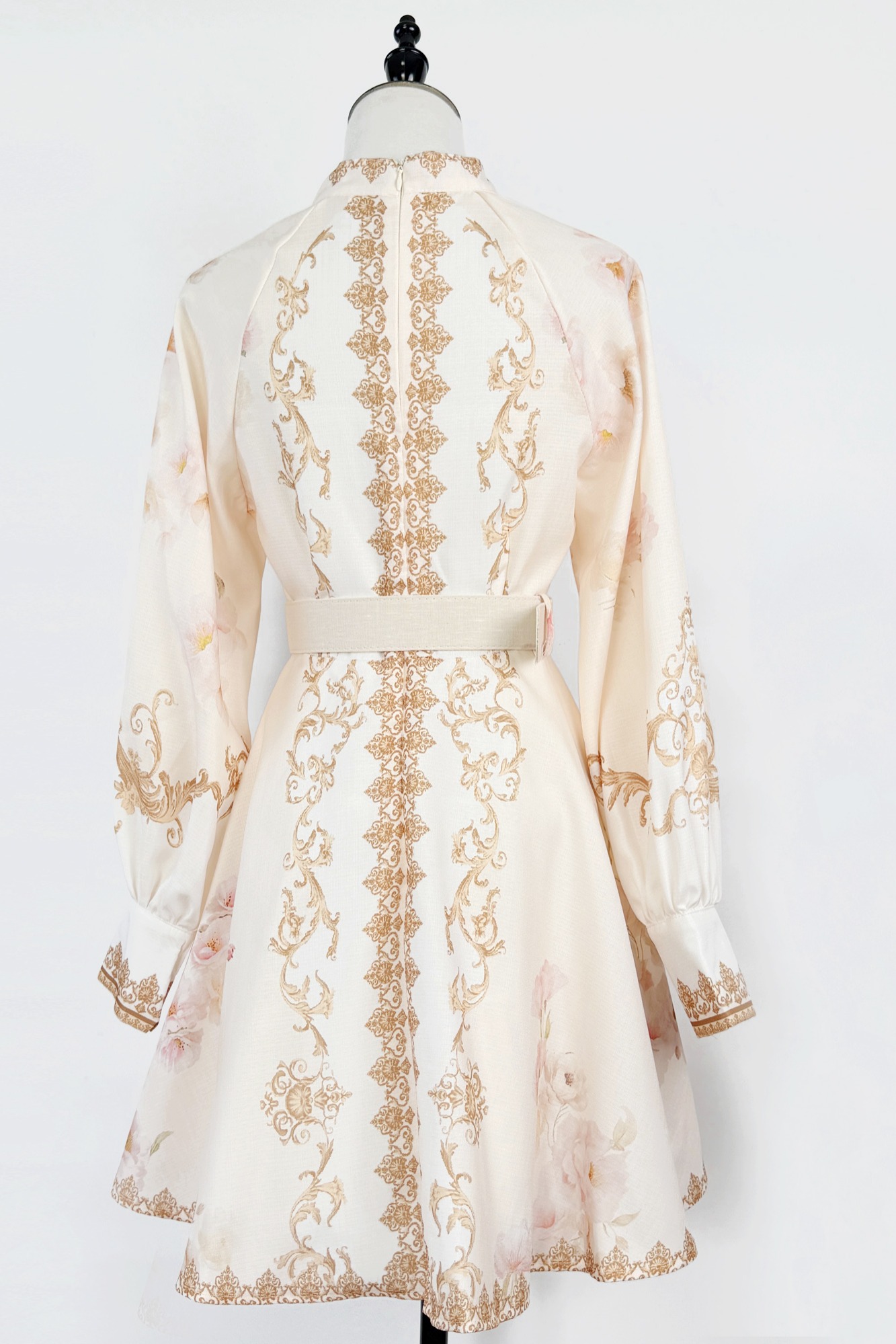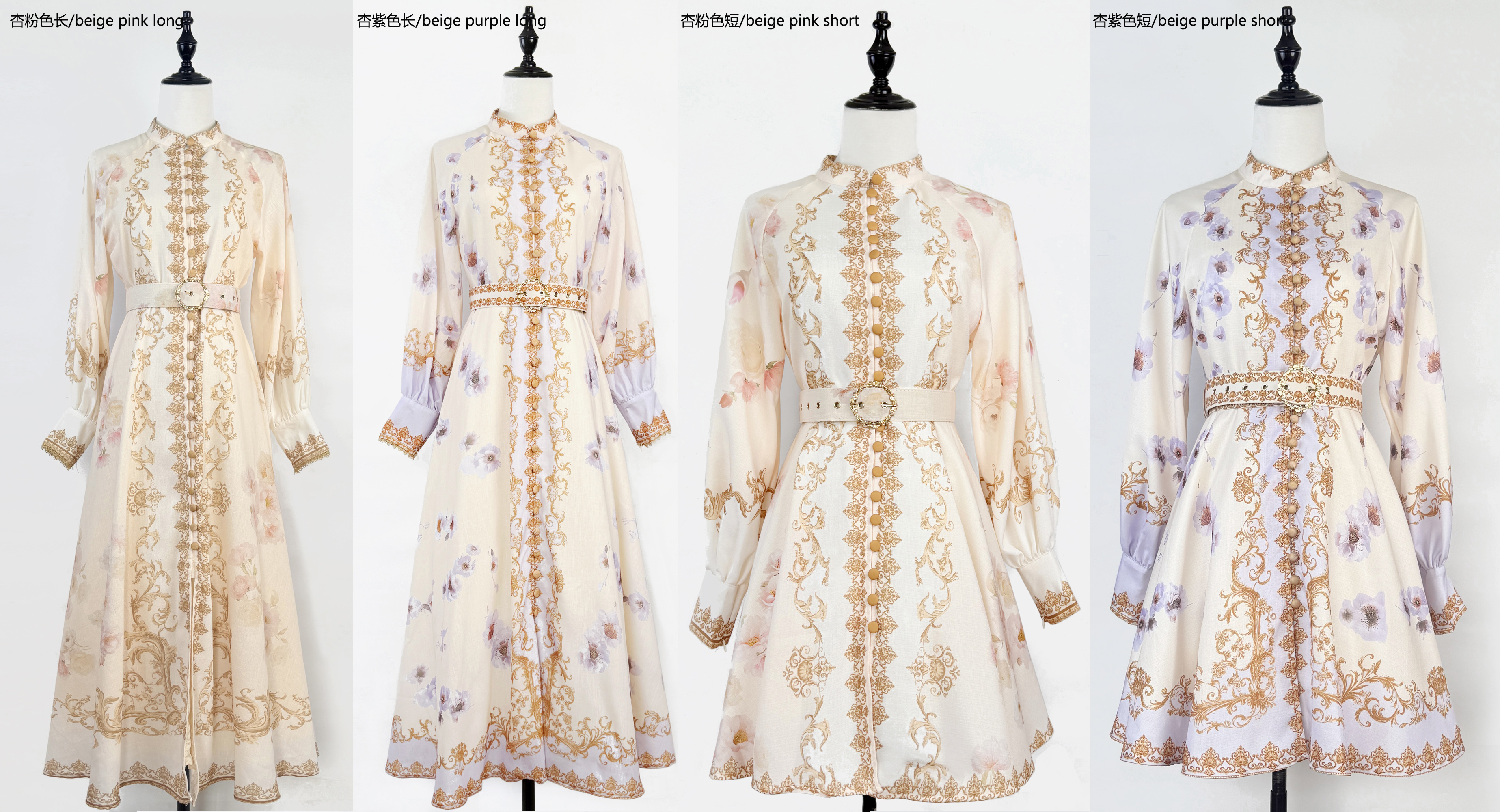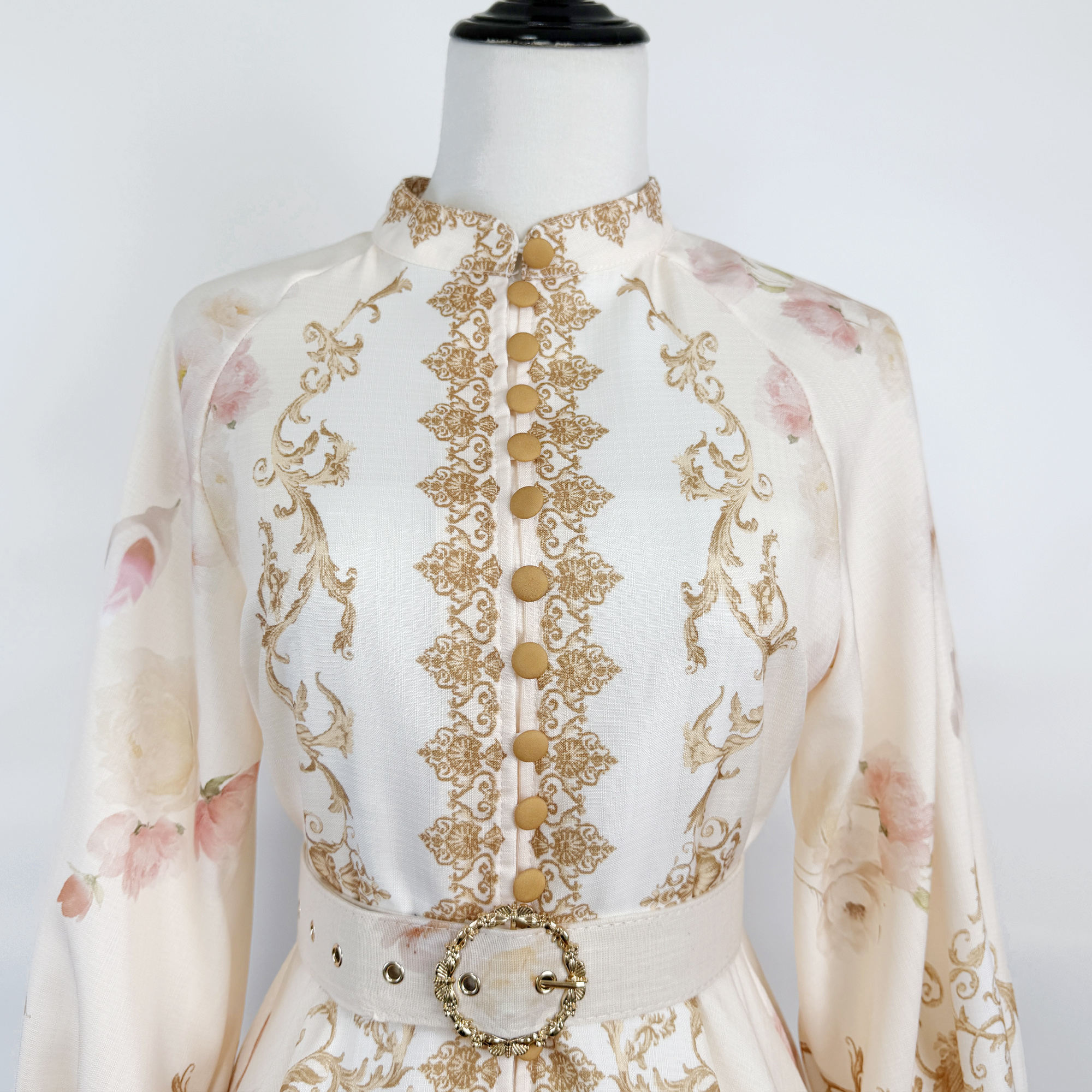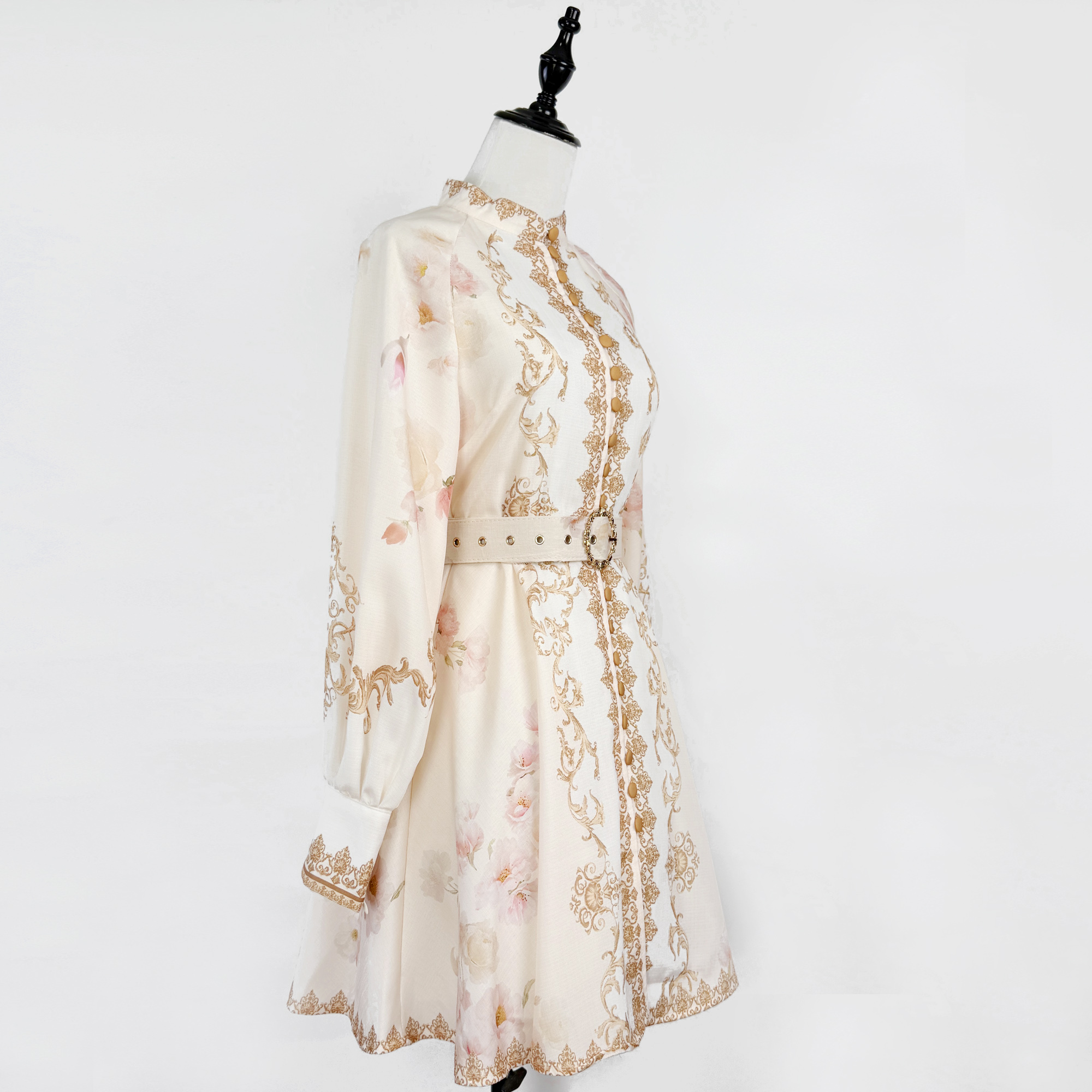 Real time shooting of new Australian niche retro positioning print stand collar lantern sleeves waist cinching dress short skirt with belt
