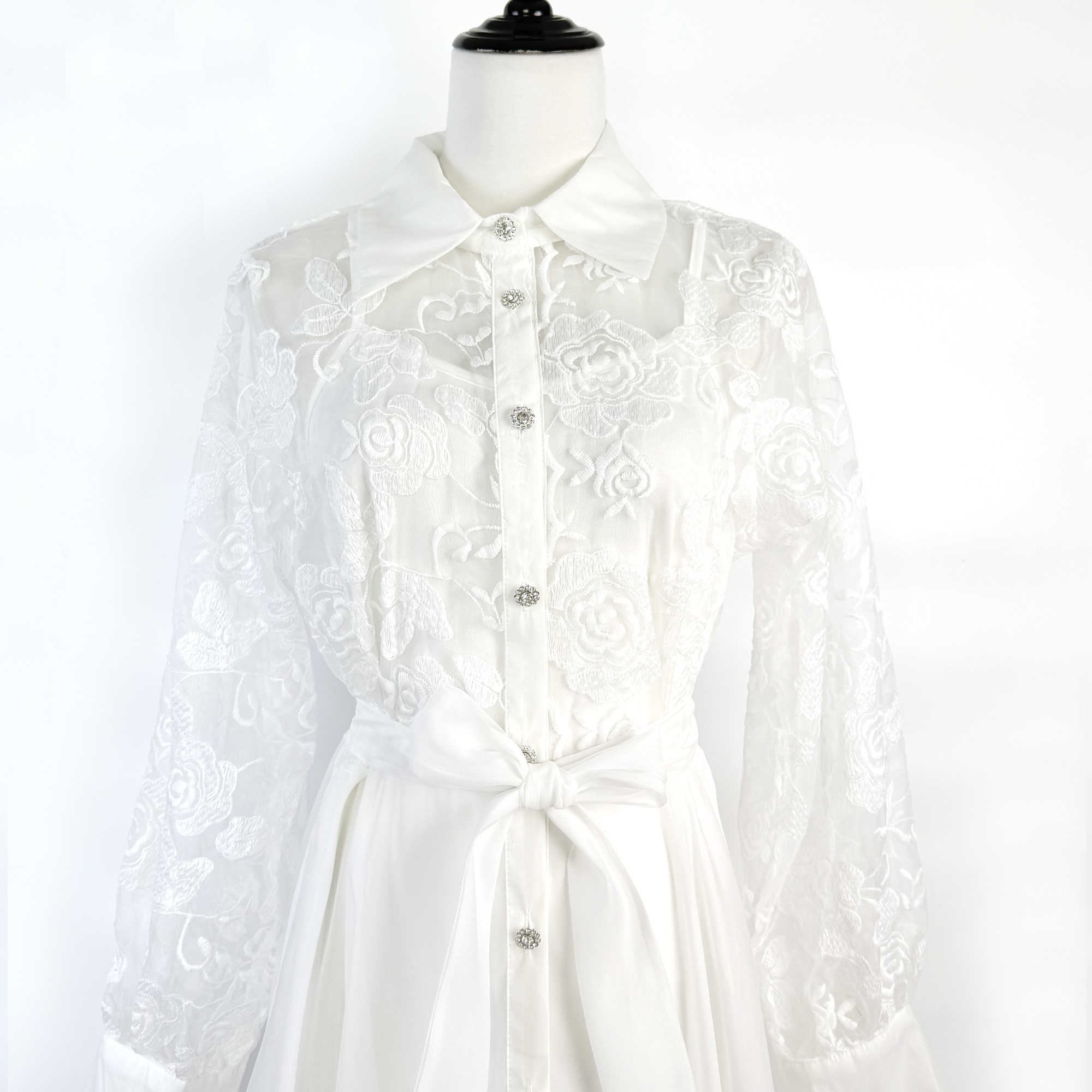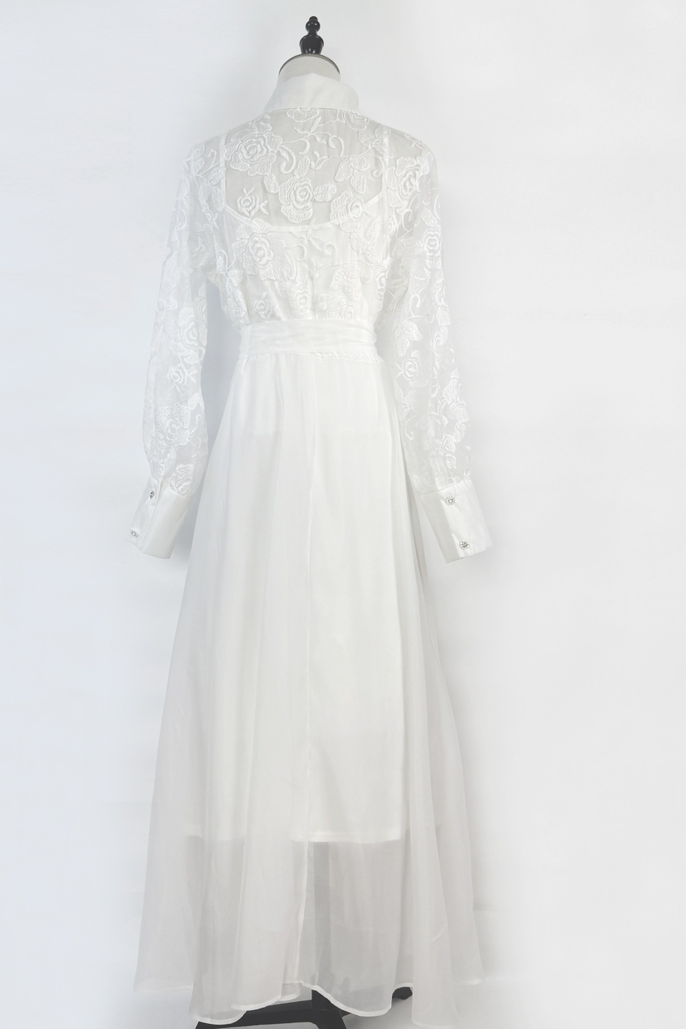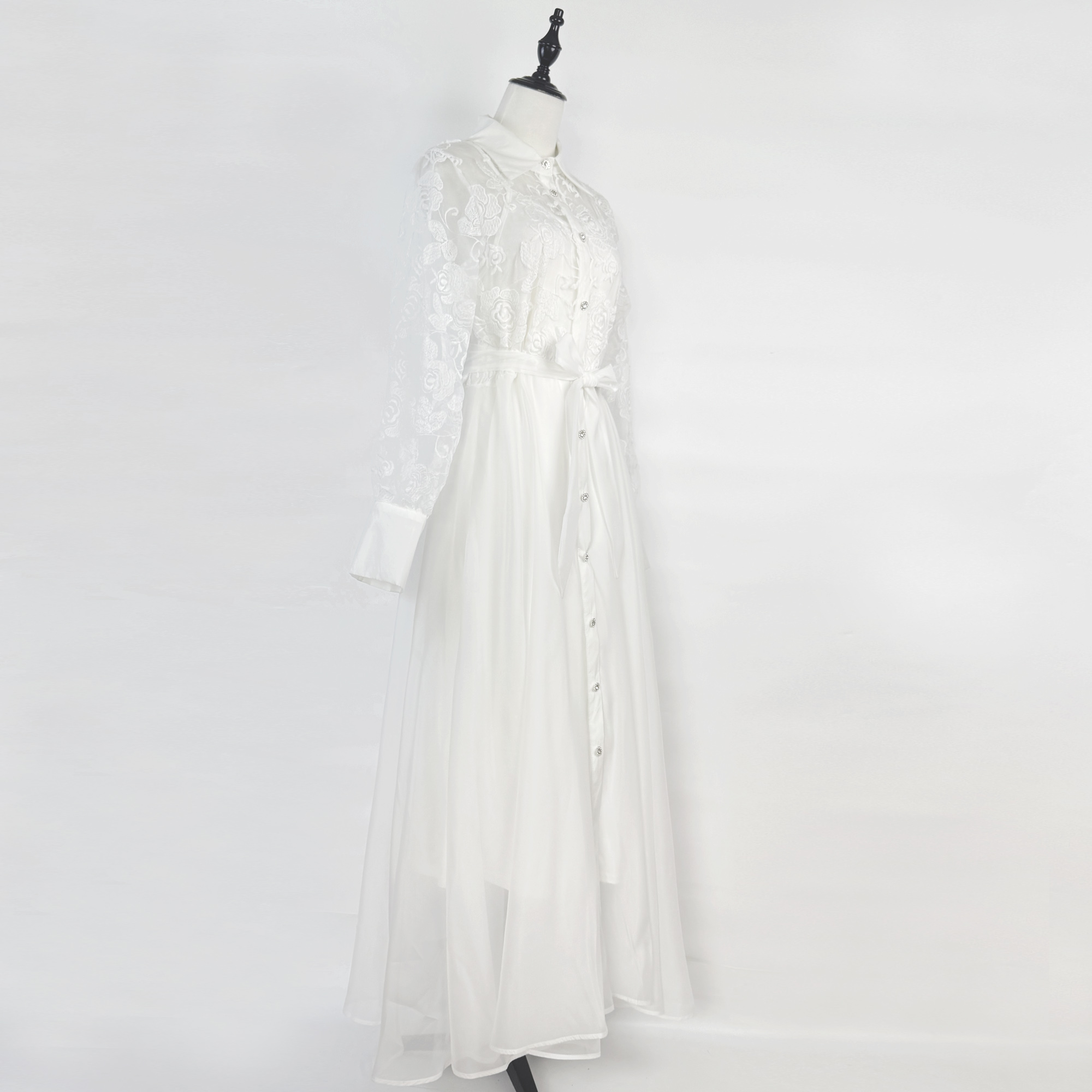 Real shot of European and American retro flower embroidery lace splicing lapel waist cinching lace up dress long skirt+suspender