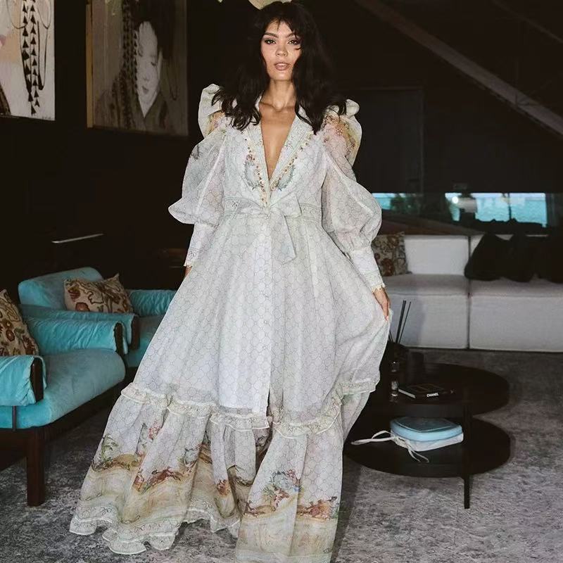New retro palace style slim fit long dress with 2025V collar, shoulder print, tie up, waist cinching, long sleeved A-line skirt