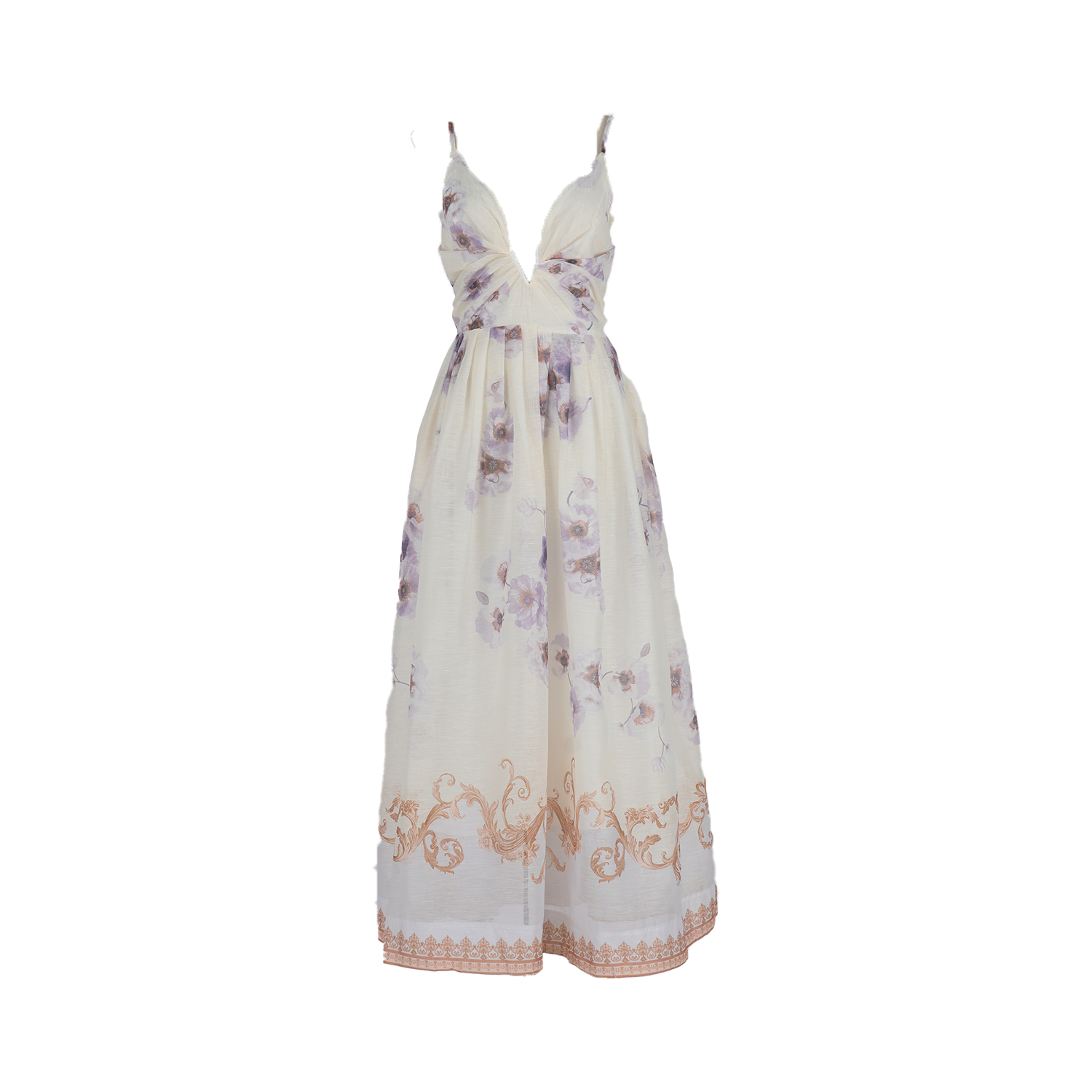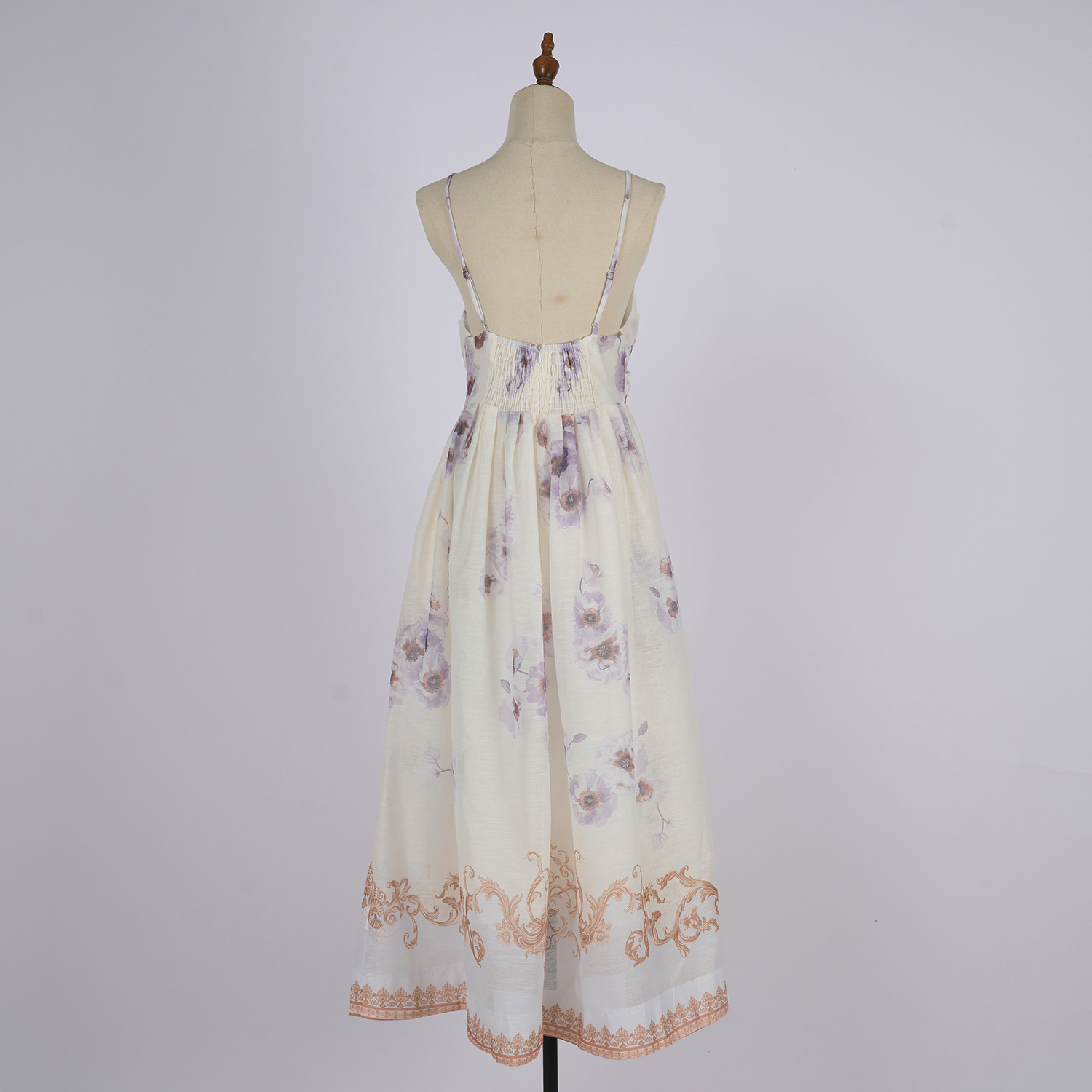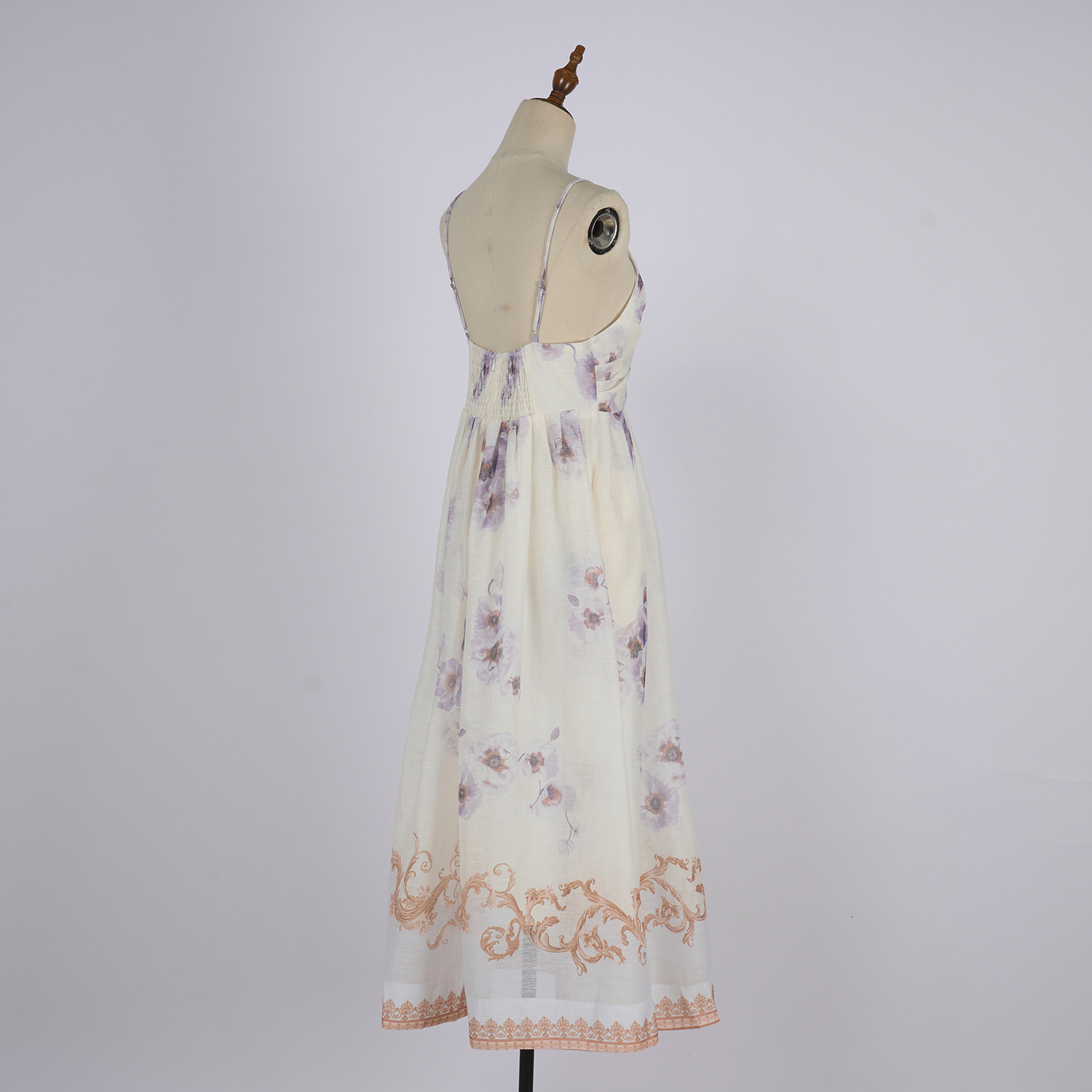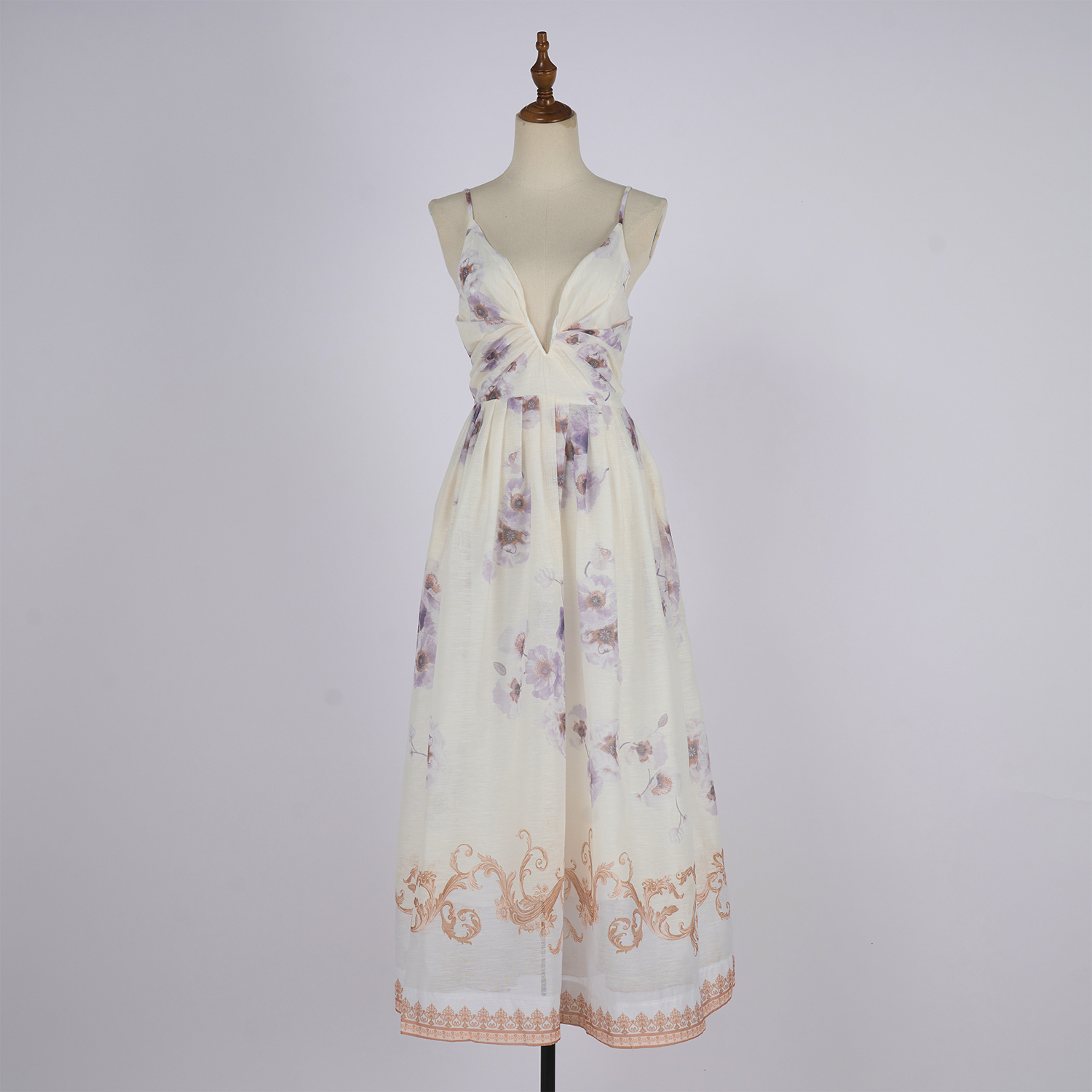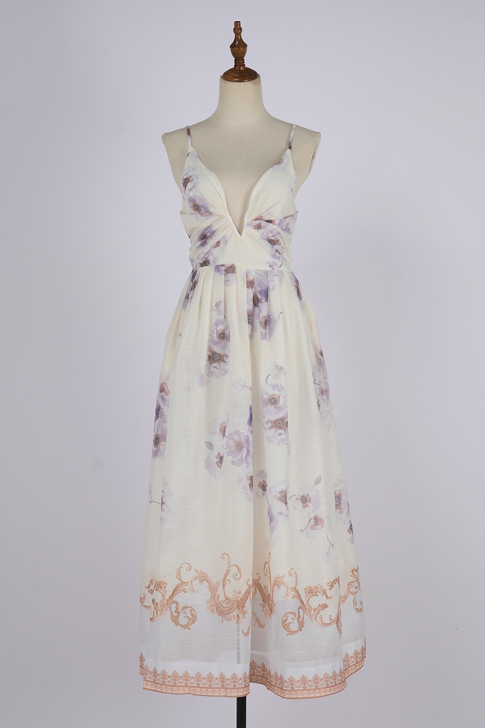 Real time shooting of linen, silk, blue floral pattern, V-neck, medium to long suspender dress