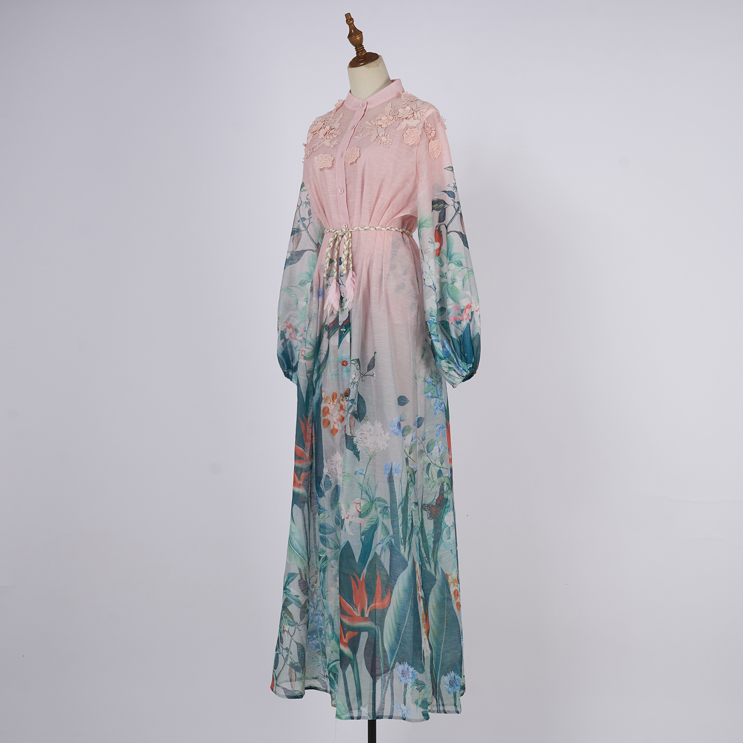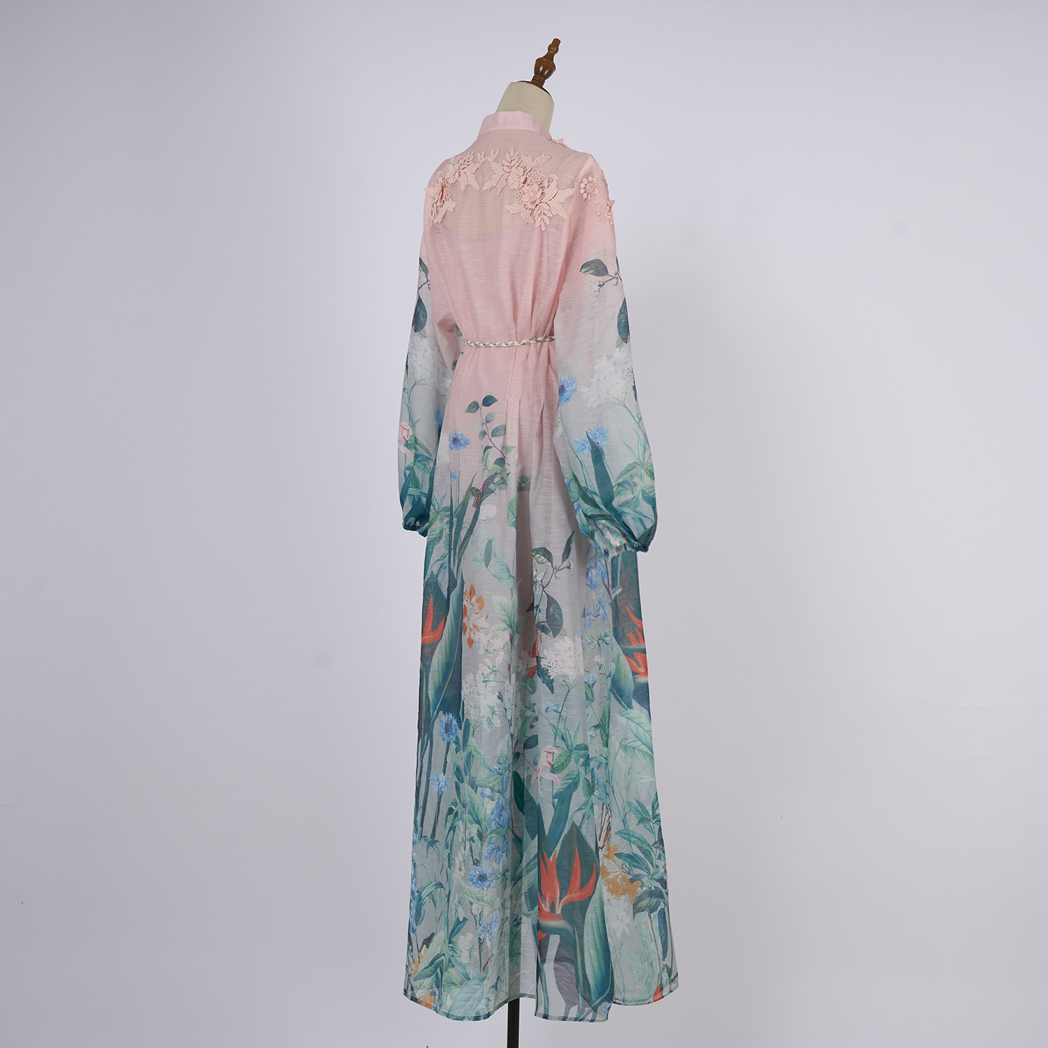 Realistic shooting of vacation style women's seaside exquisite printed single breasted bubble sleeves, large swing lace up dress