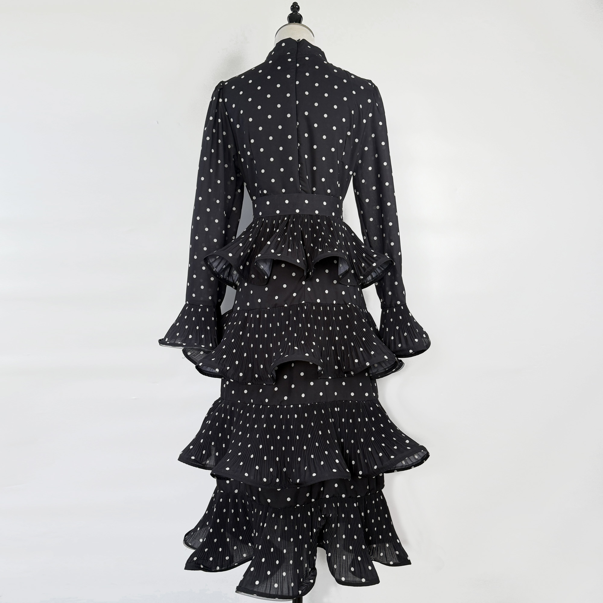 Real shot of Australia's autumn new classic polka dot print stand up collar pleated ruffle edge cake skirt dress