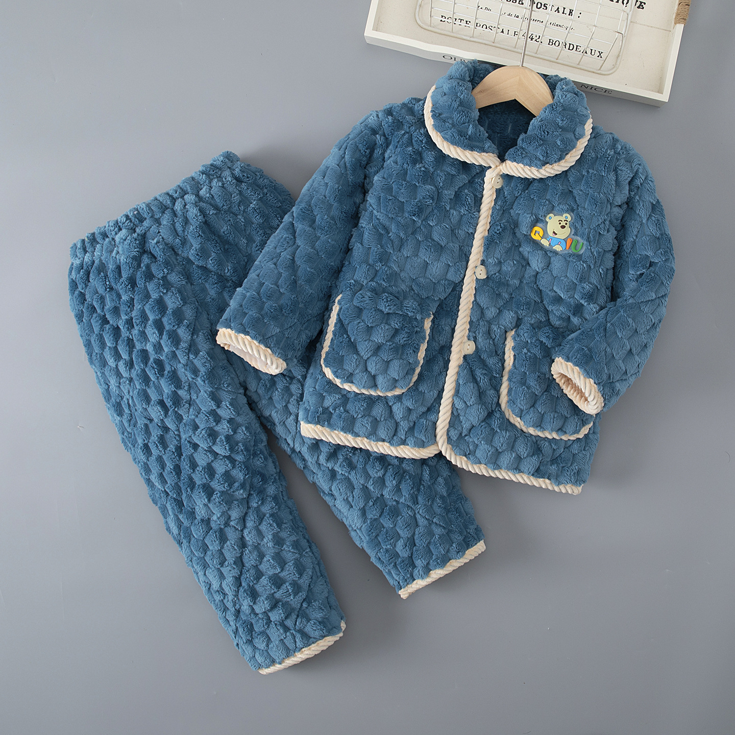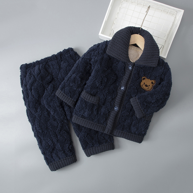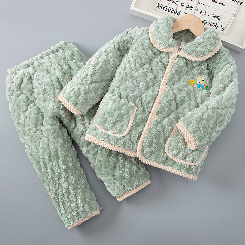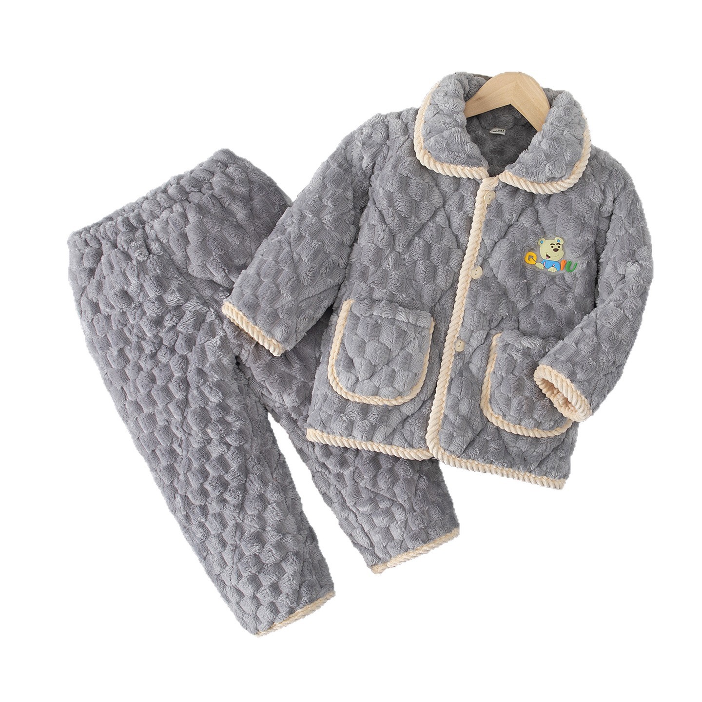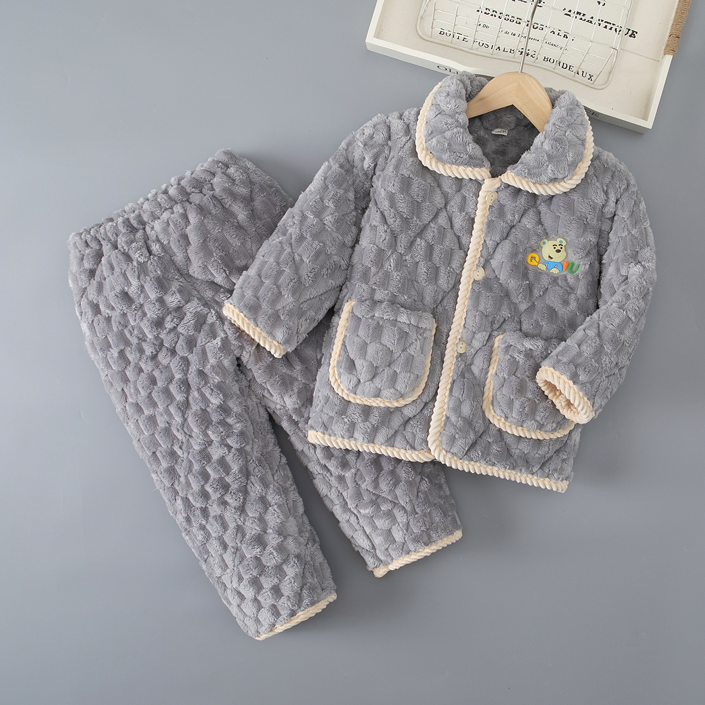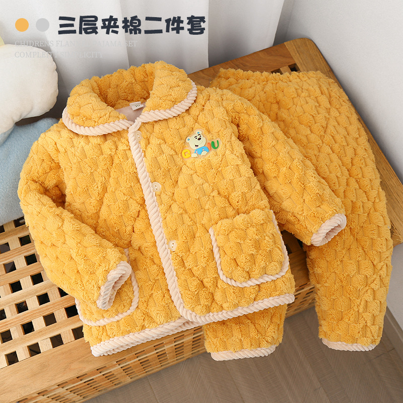 Autumn and winter children's three-layer cotton pajama set with coral fleece thickened flannel for boys and girls, baby home clothes
