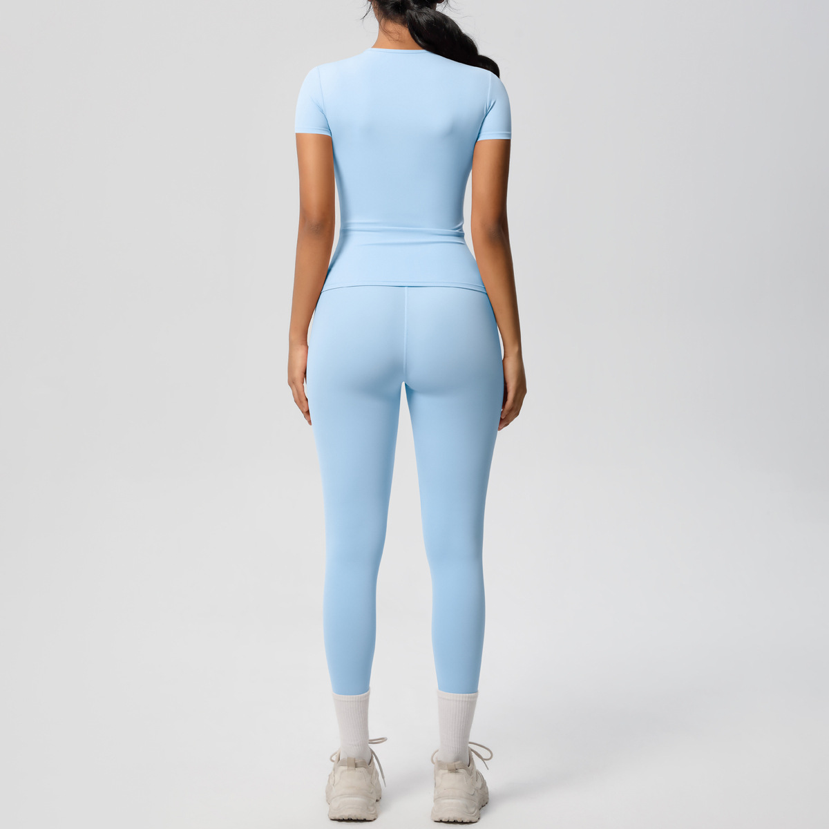 Cross border European and American sports nude skin friendly solid color sports T-shirt elastic short sleeved yoga pants high waist fitness suit for women