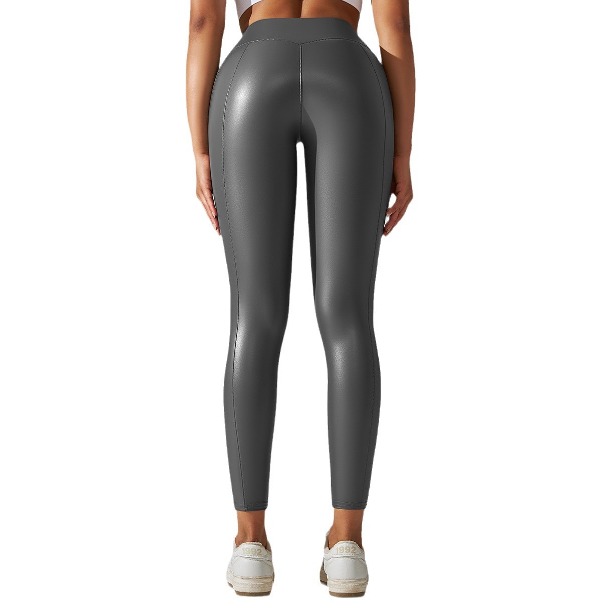 New European and American cross-border PU leather pants in stock, high elasticity, sexy solid color, bright black tight pants, running, fitness, yoga pants