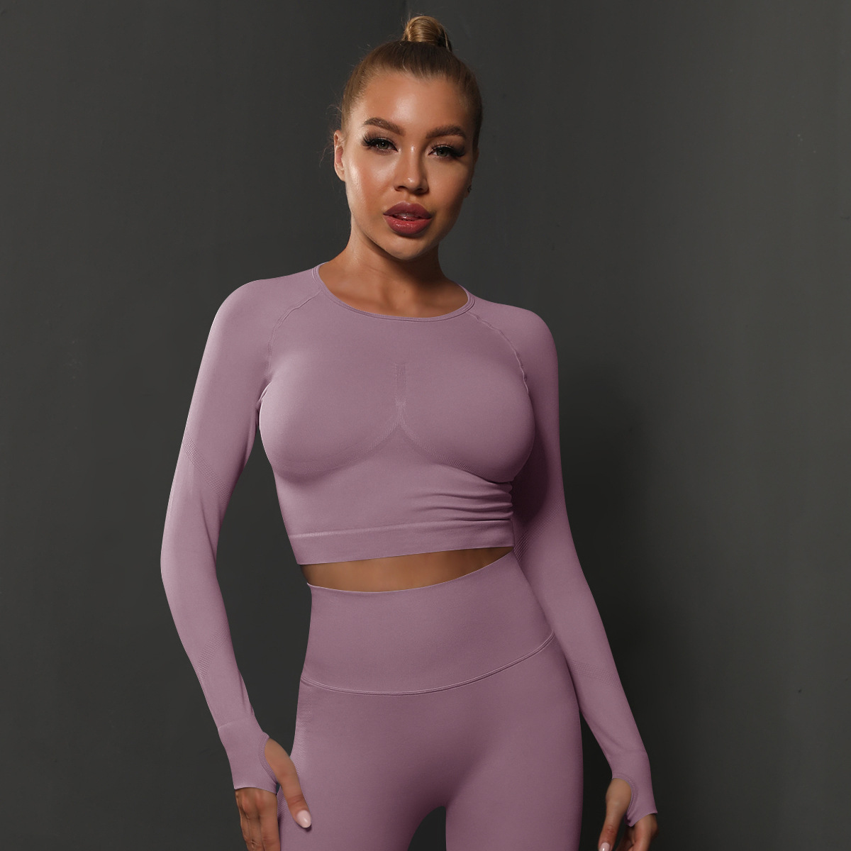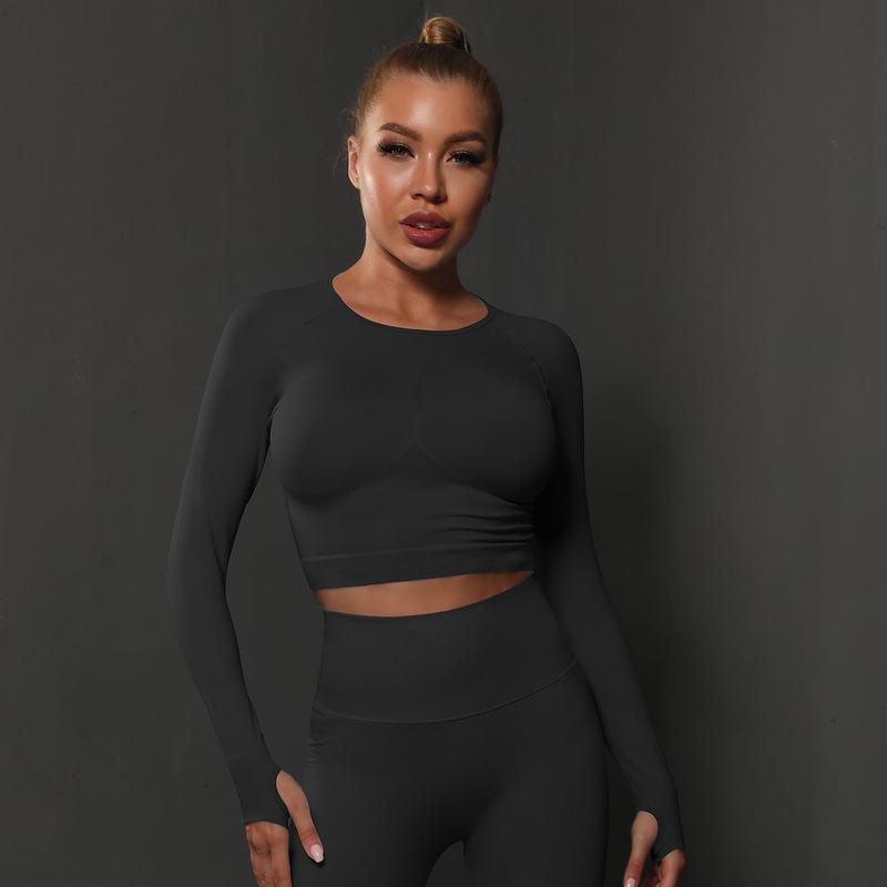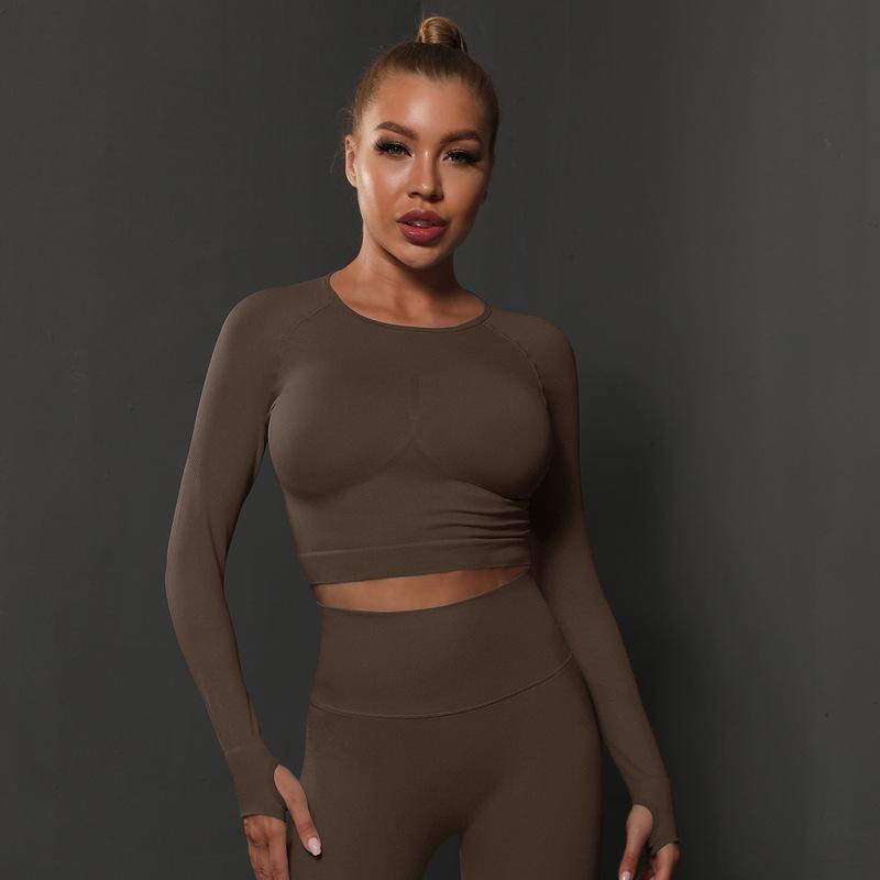 European and American seamless knitted solid color peach tight T-shirt top, fitness and yoga clothes, moisture absorbing and shaping long sleeved women
