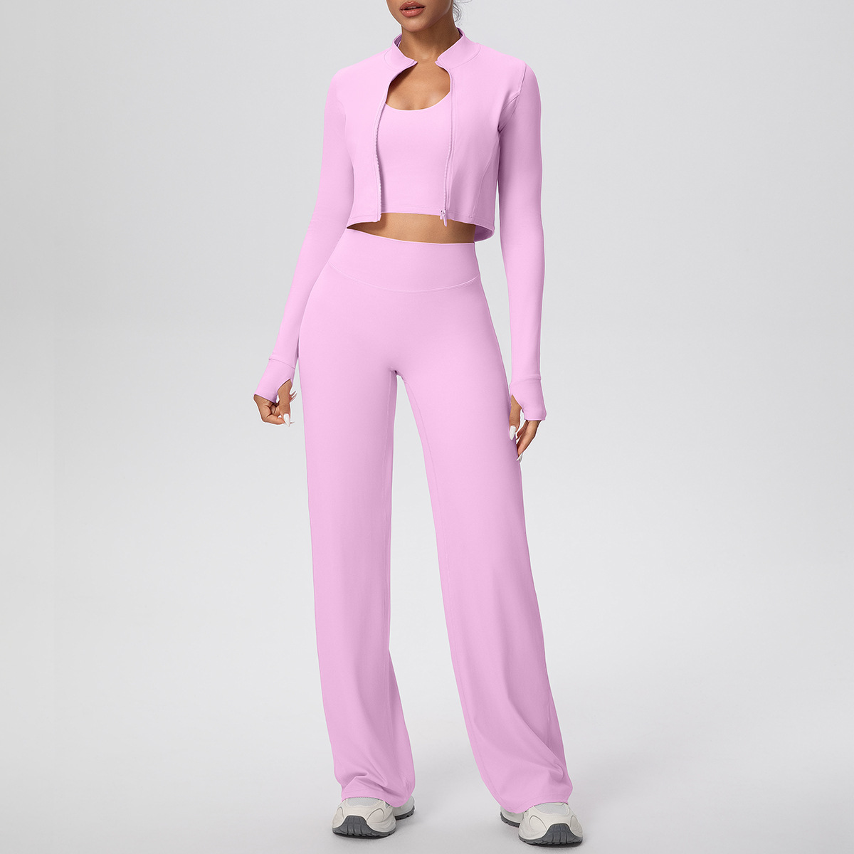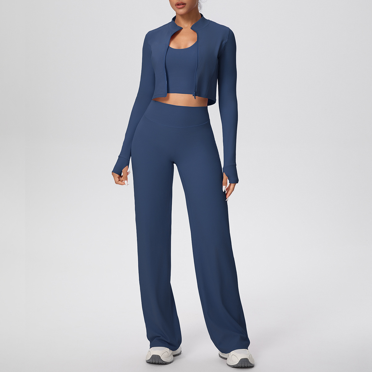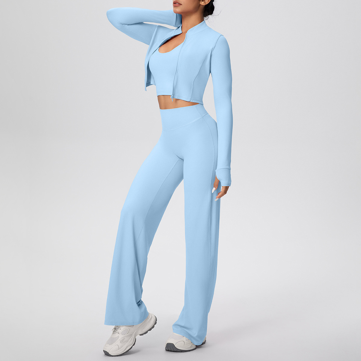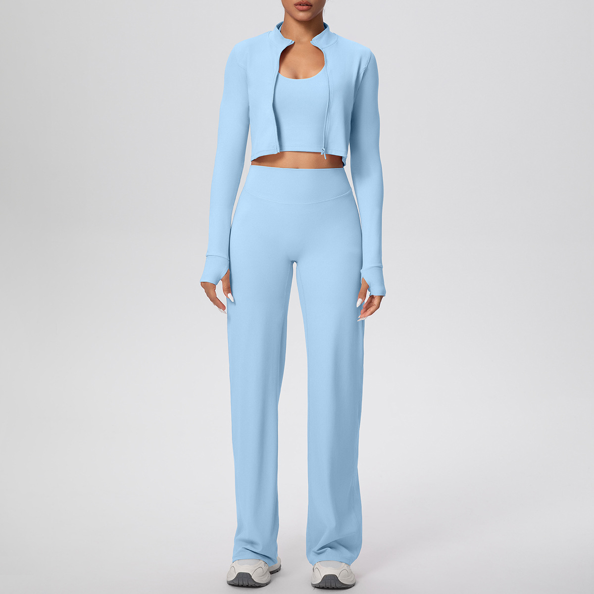 European and American solid color sports zipper long sleeved jacket hanging neck vest loose straight leg pants fitness suit yoga three piece set