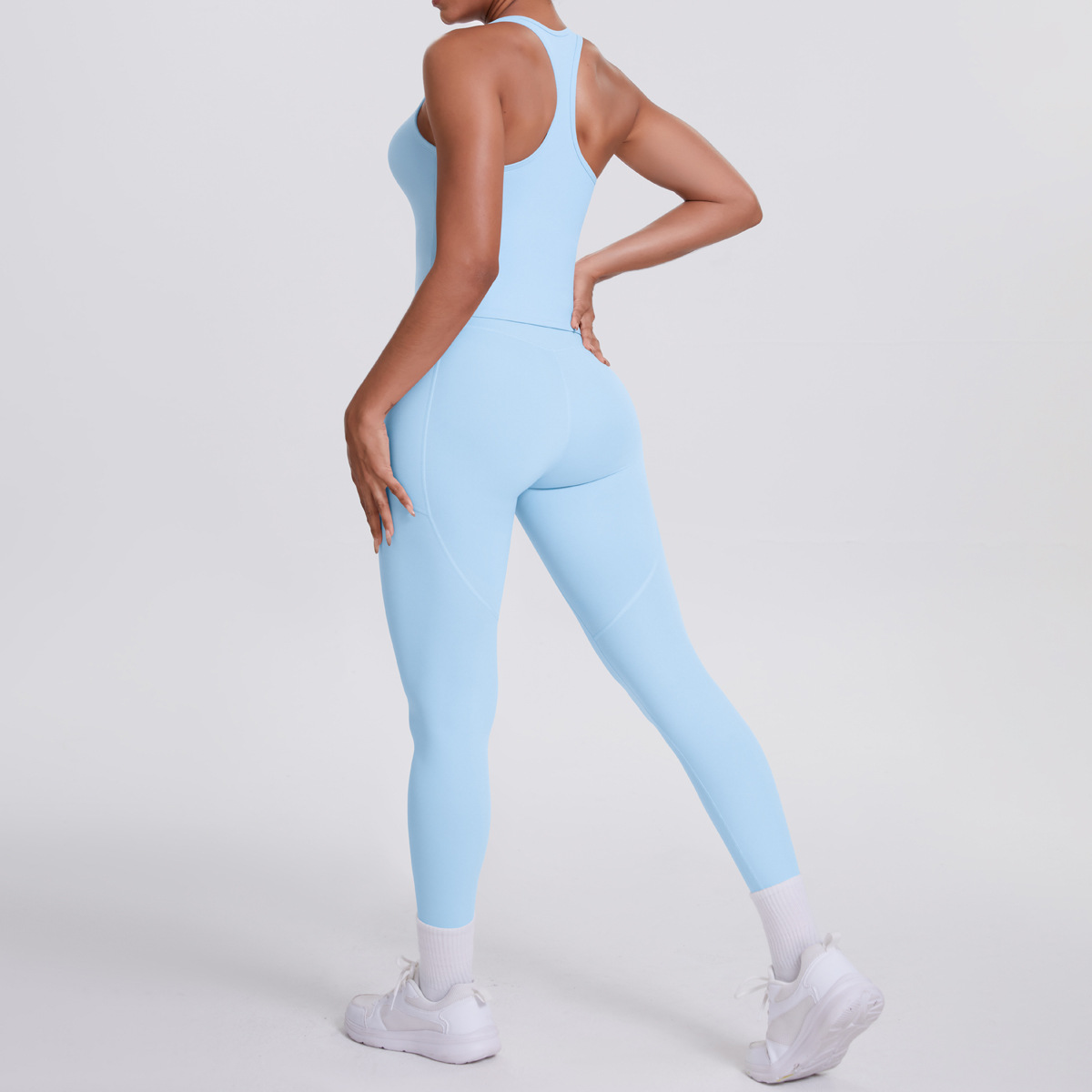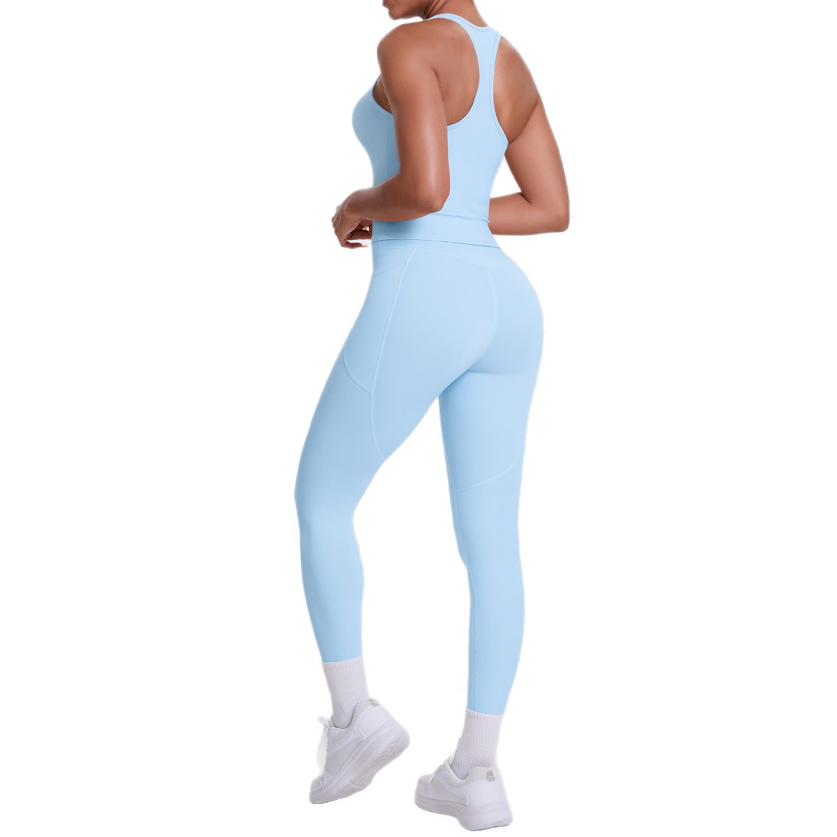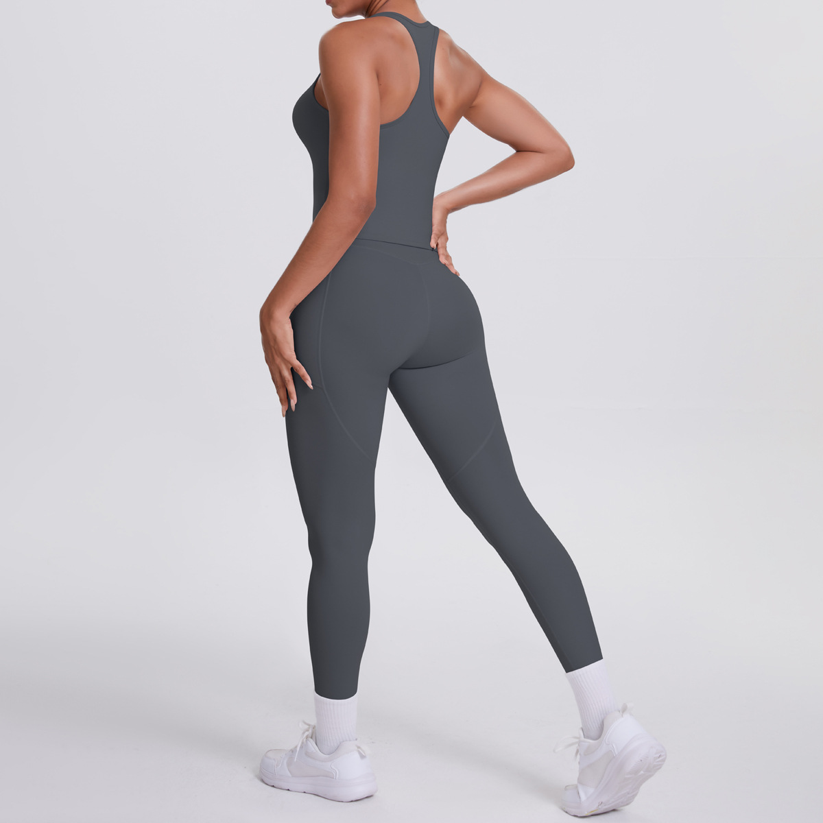 European and American brushed herringbone back sports vest, long pants, yoga pants, running side pockets, fitness yoga suit set for women