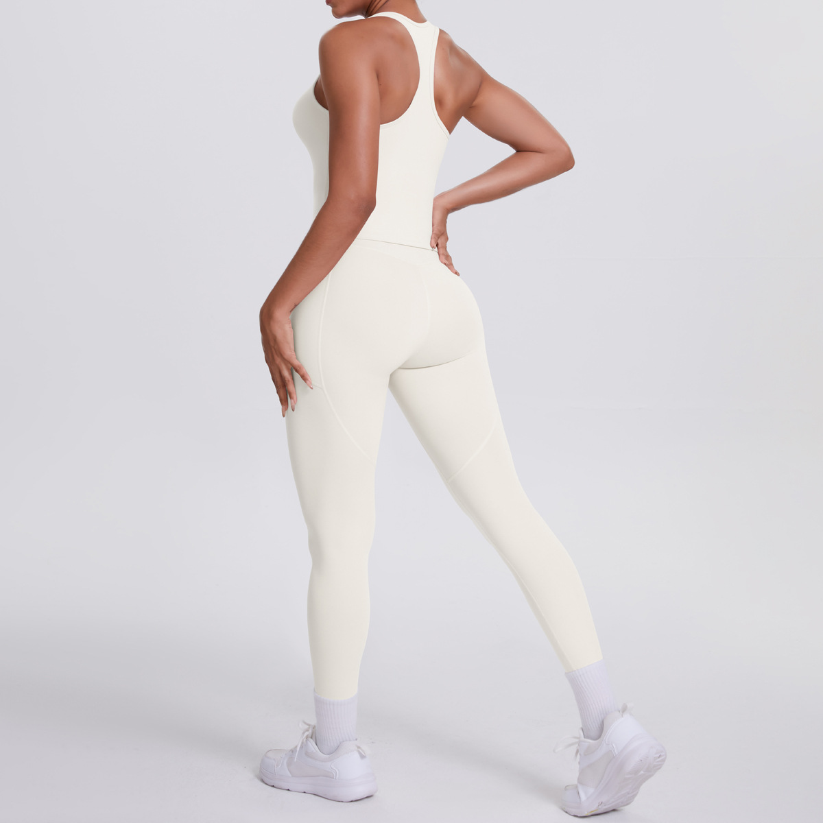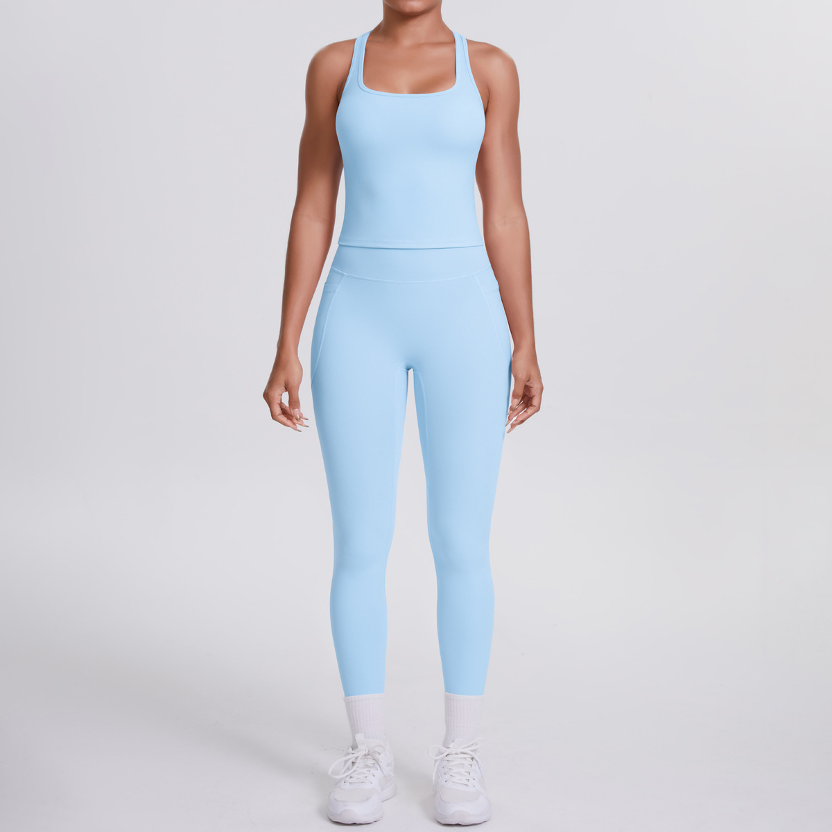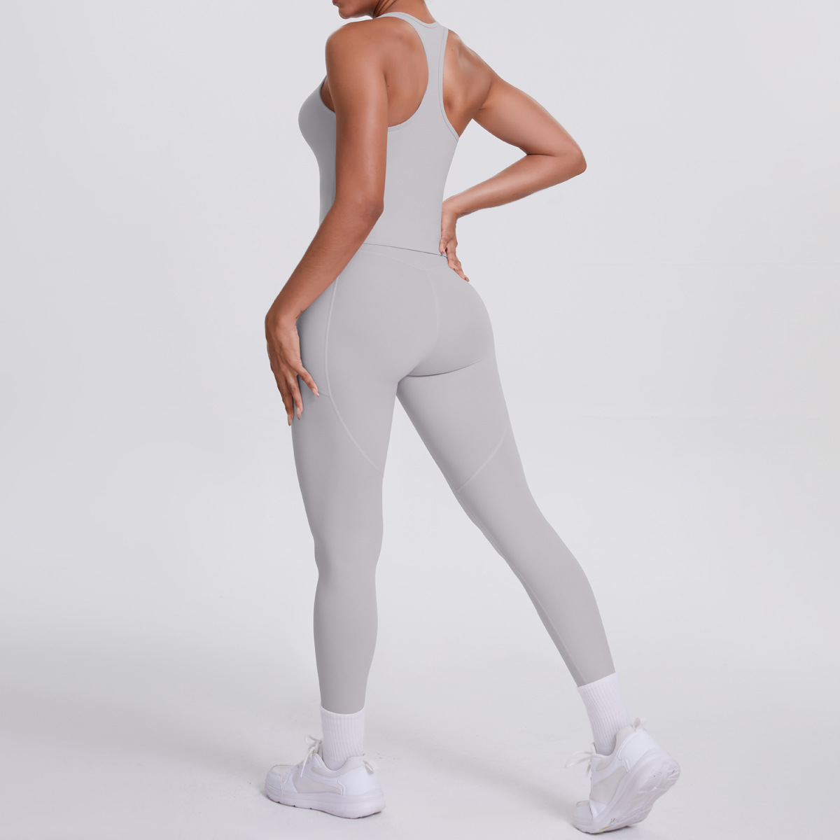 European and American brushed herringbone back sports vest, long pants, yoga pants, running side pockets, fitness yoga suit set for women