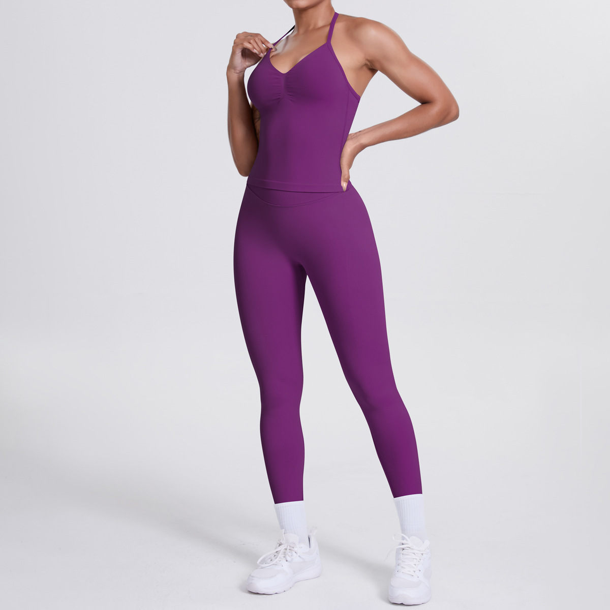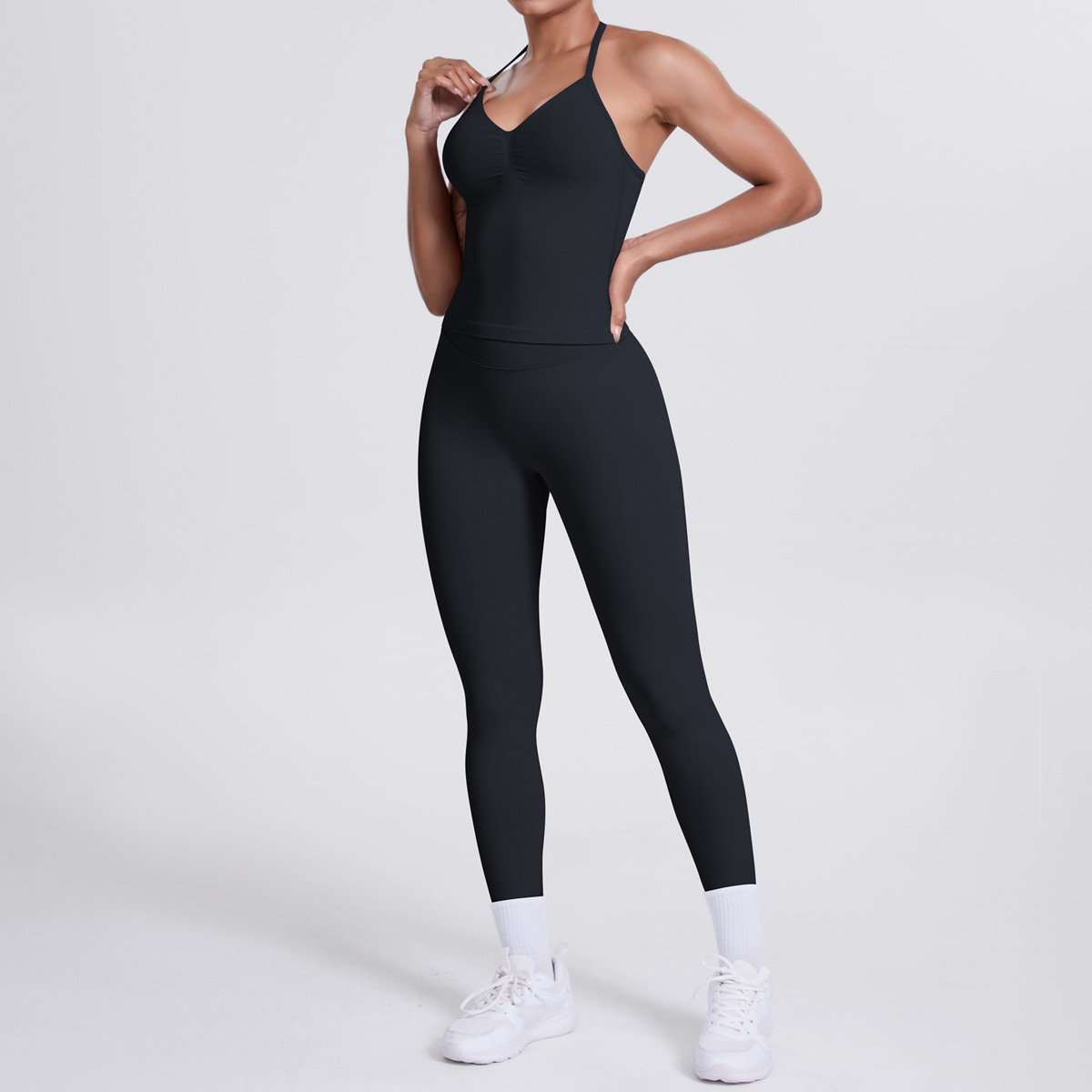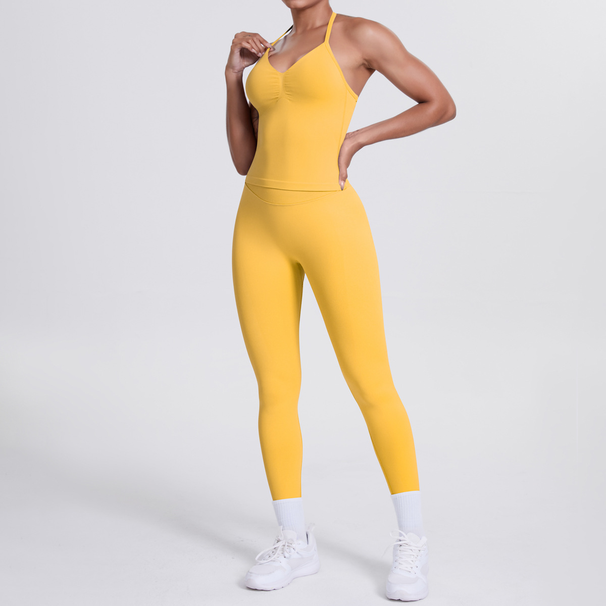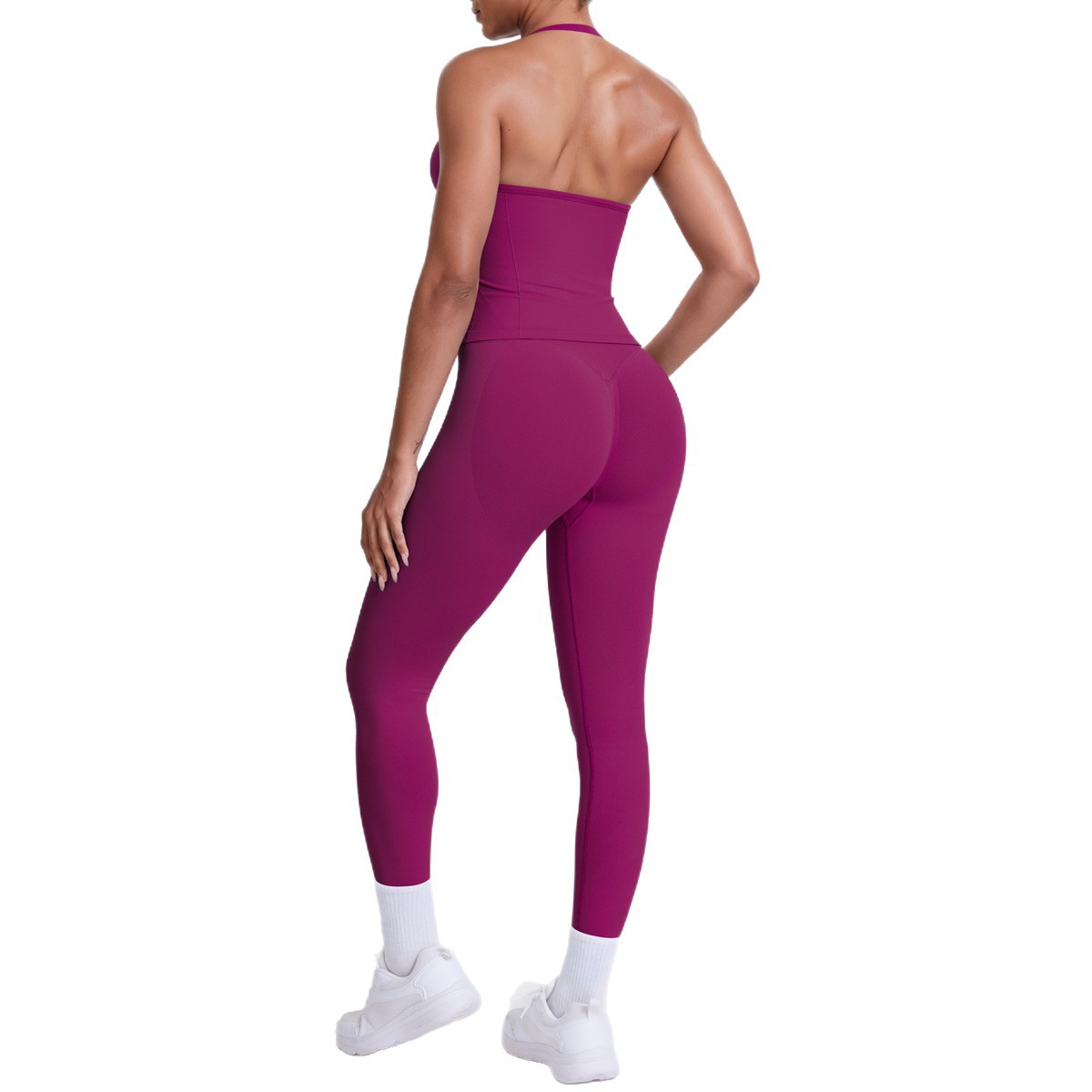 European and American solid color vest yoga suit, high waist peach hip sports pants, suspender, neck hanging bra, fitness yoga suit
