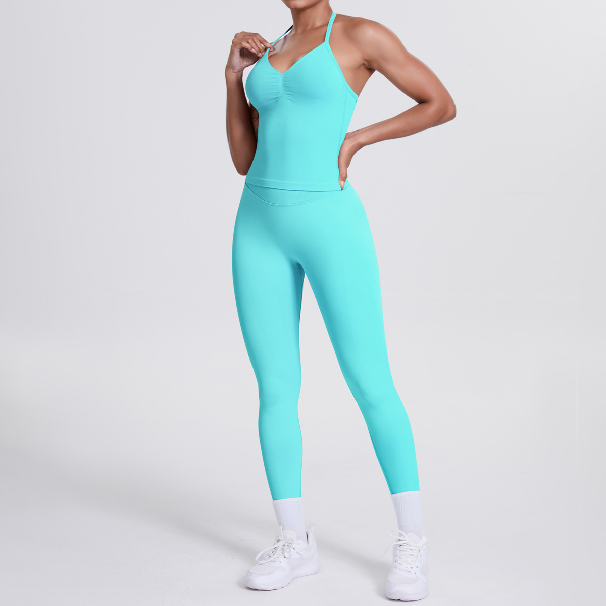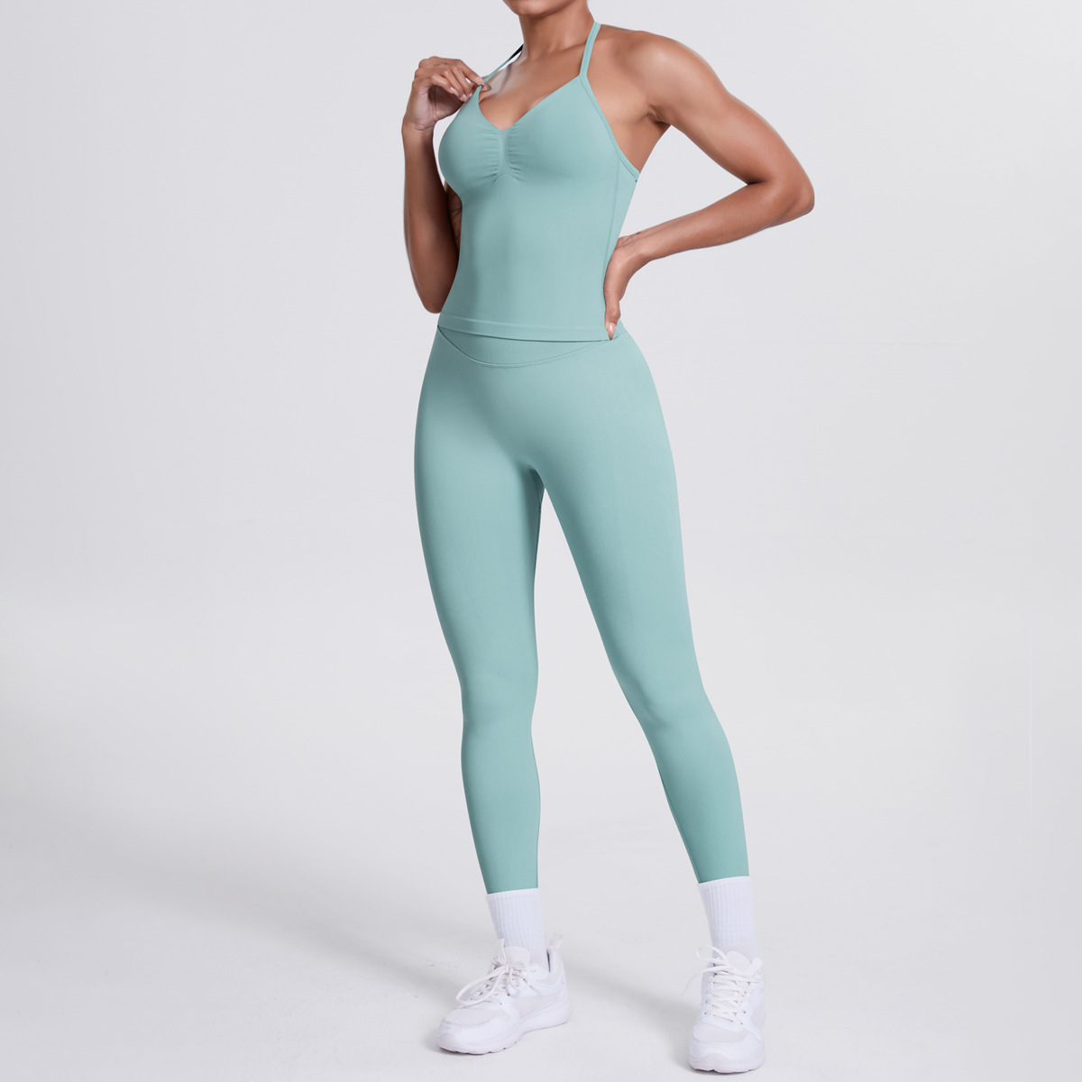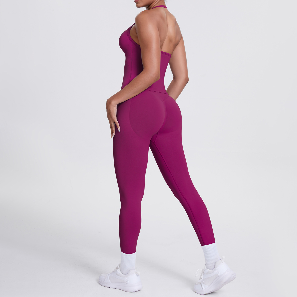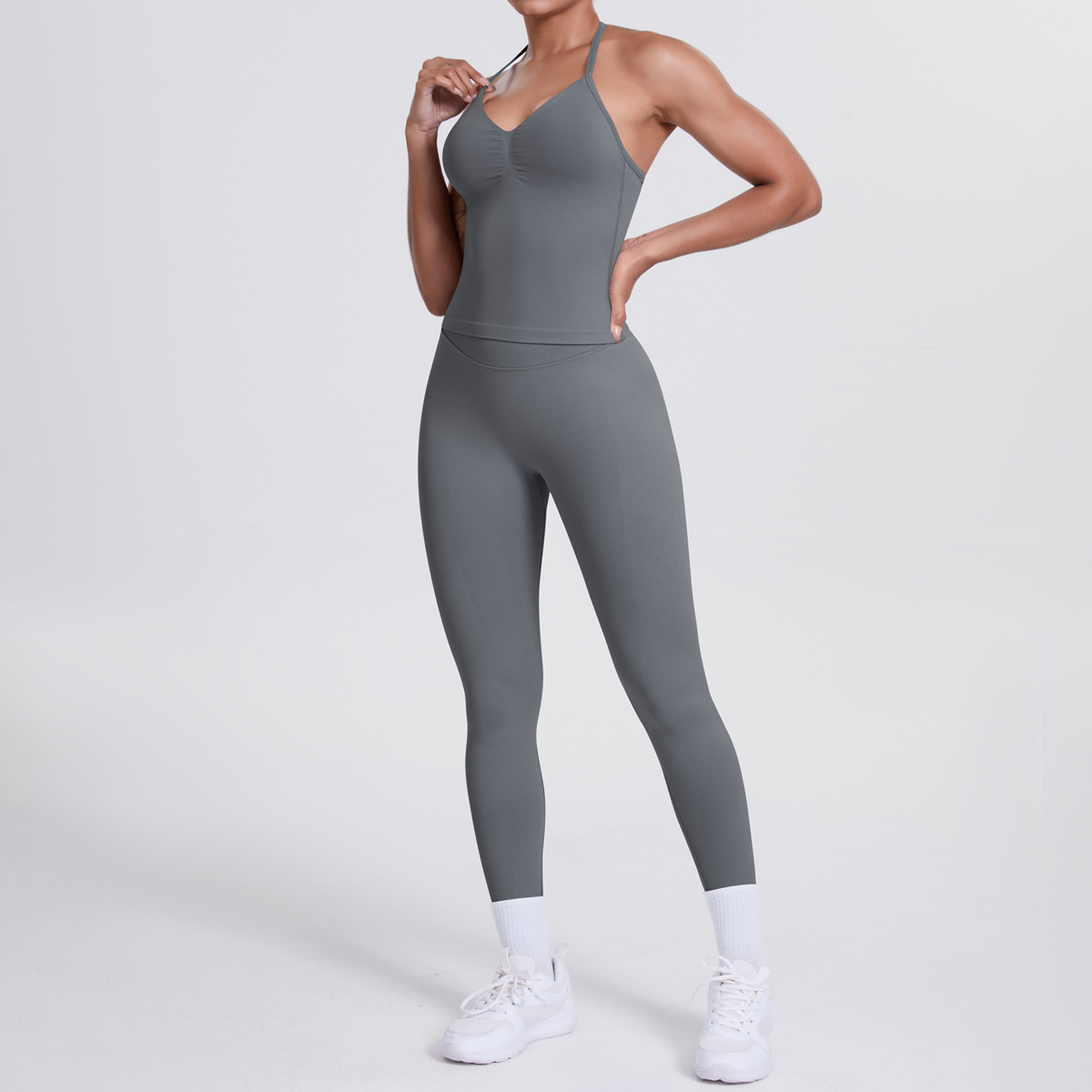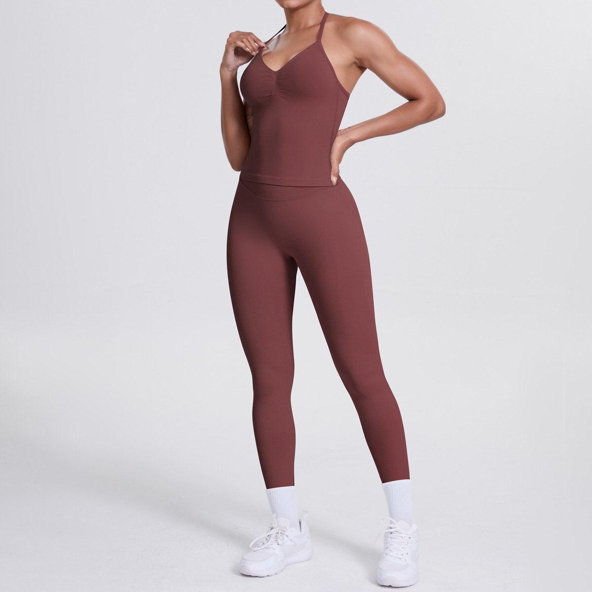 European and American solid color vest yoga suit, high waist peach hip sports pants, suspender, neck hanging bra, fitness yoga suit