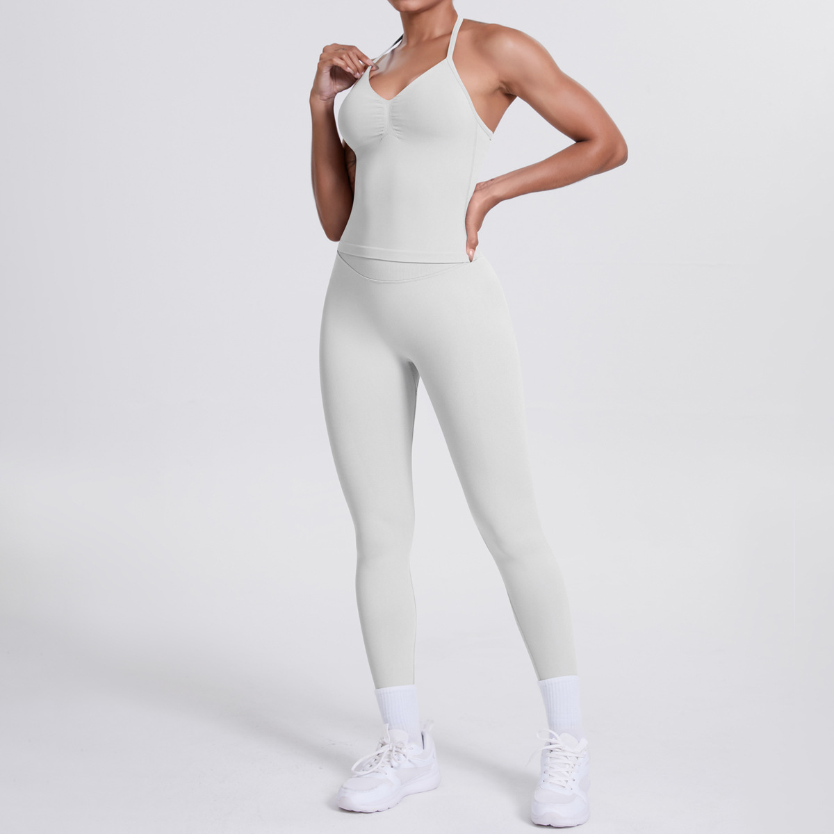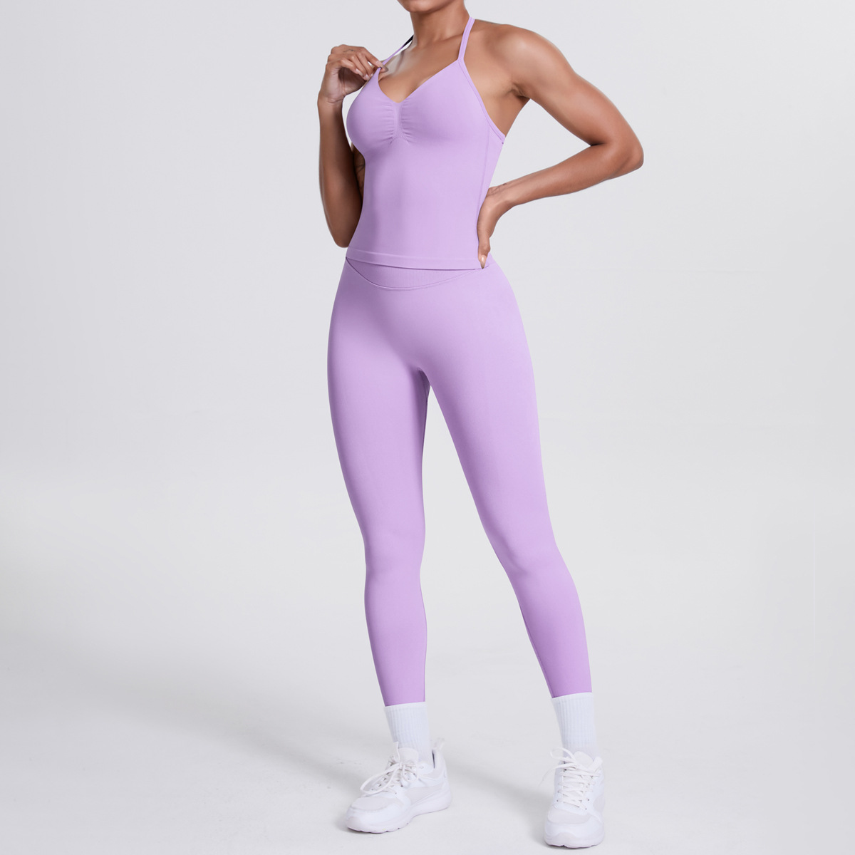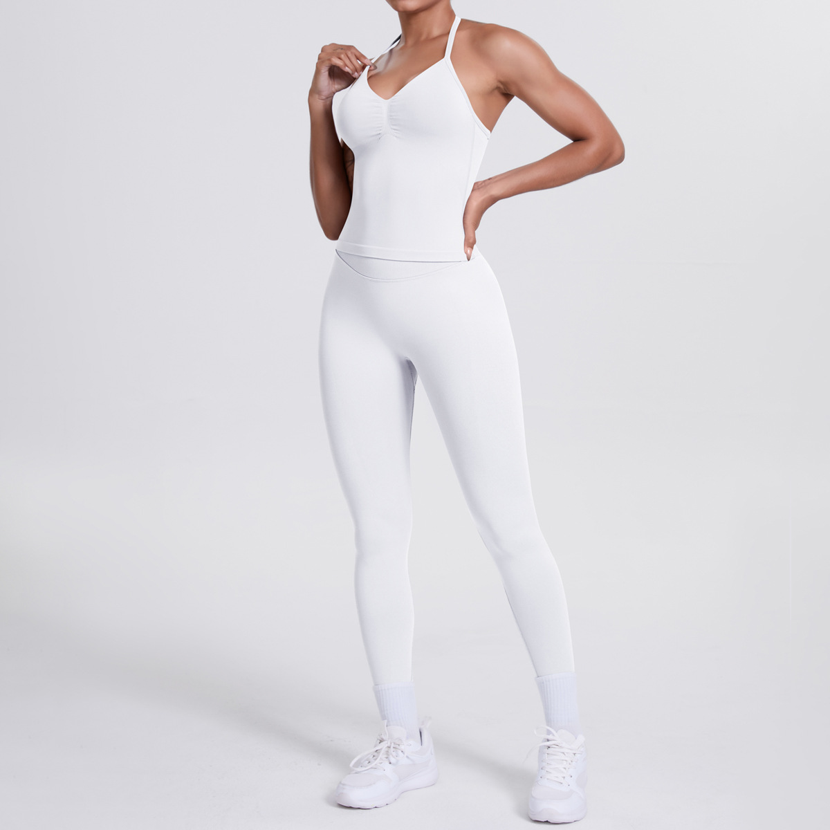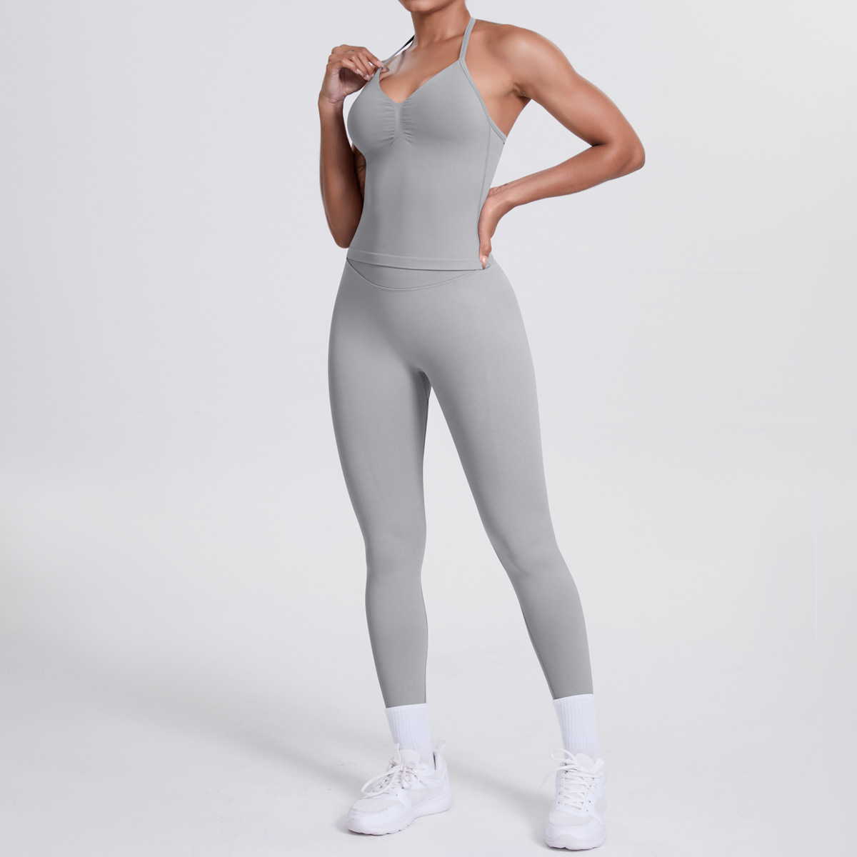 European and American solid color vest yoga suit, high waist peach hip sports pants, suspender, neck hanging bra, fitness yoga suit
