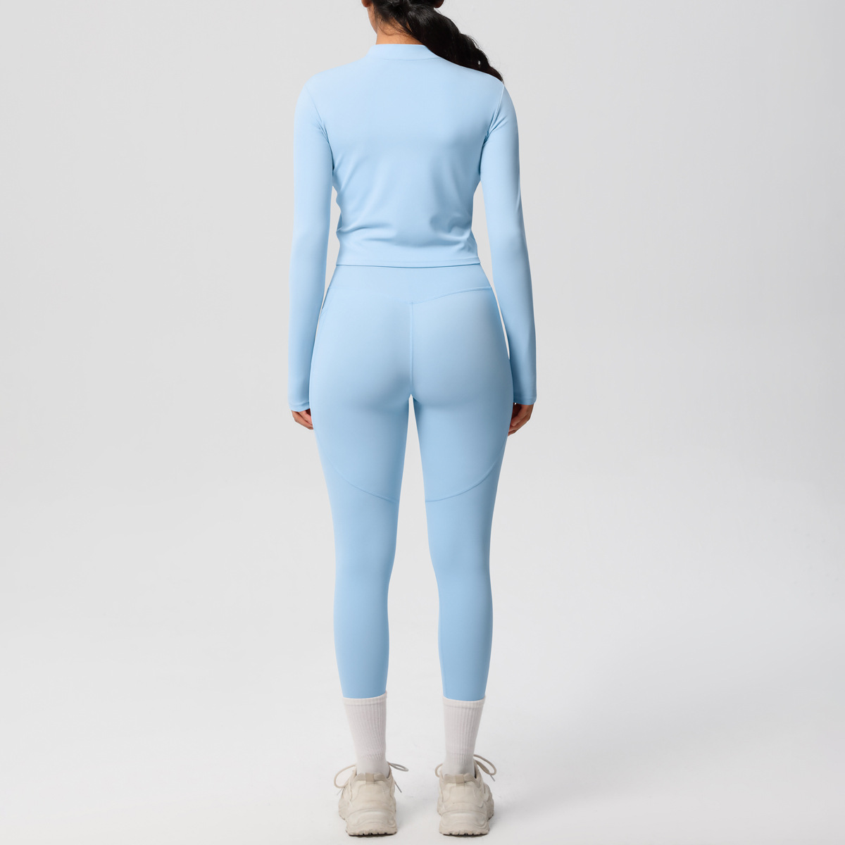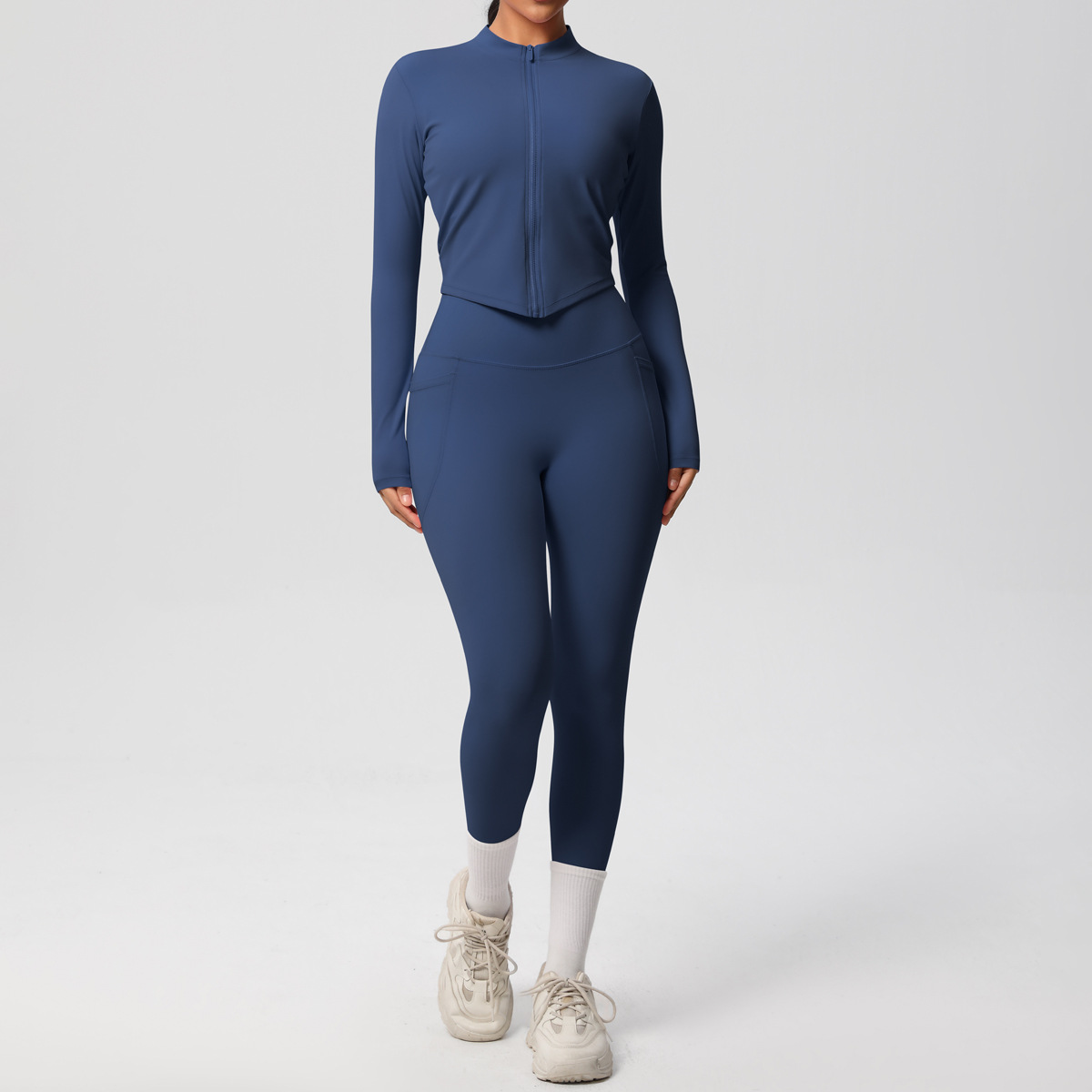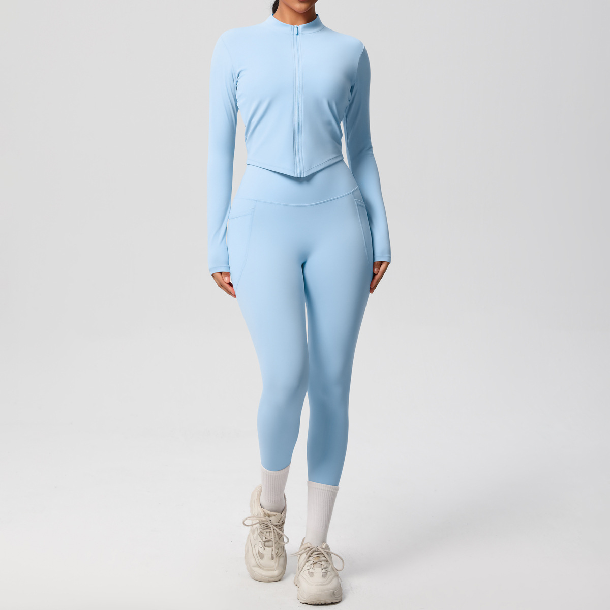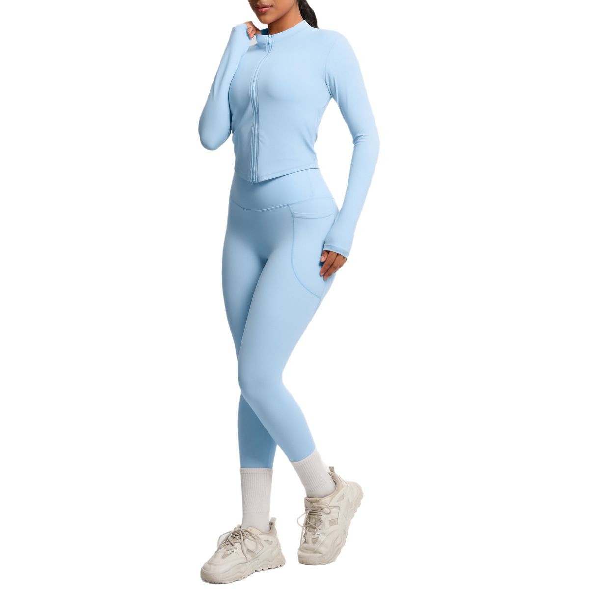 European and American style cross-border solid color zipper long sleeved jacket, high elasticity breathable tight shaping yoga suit, fitness pants set for women