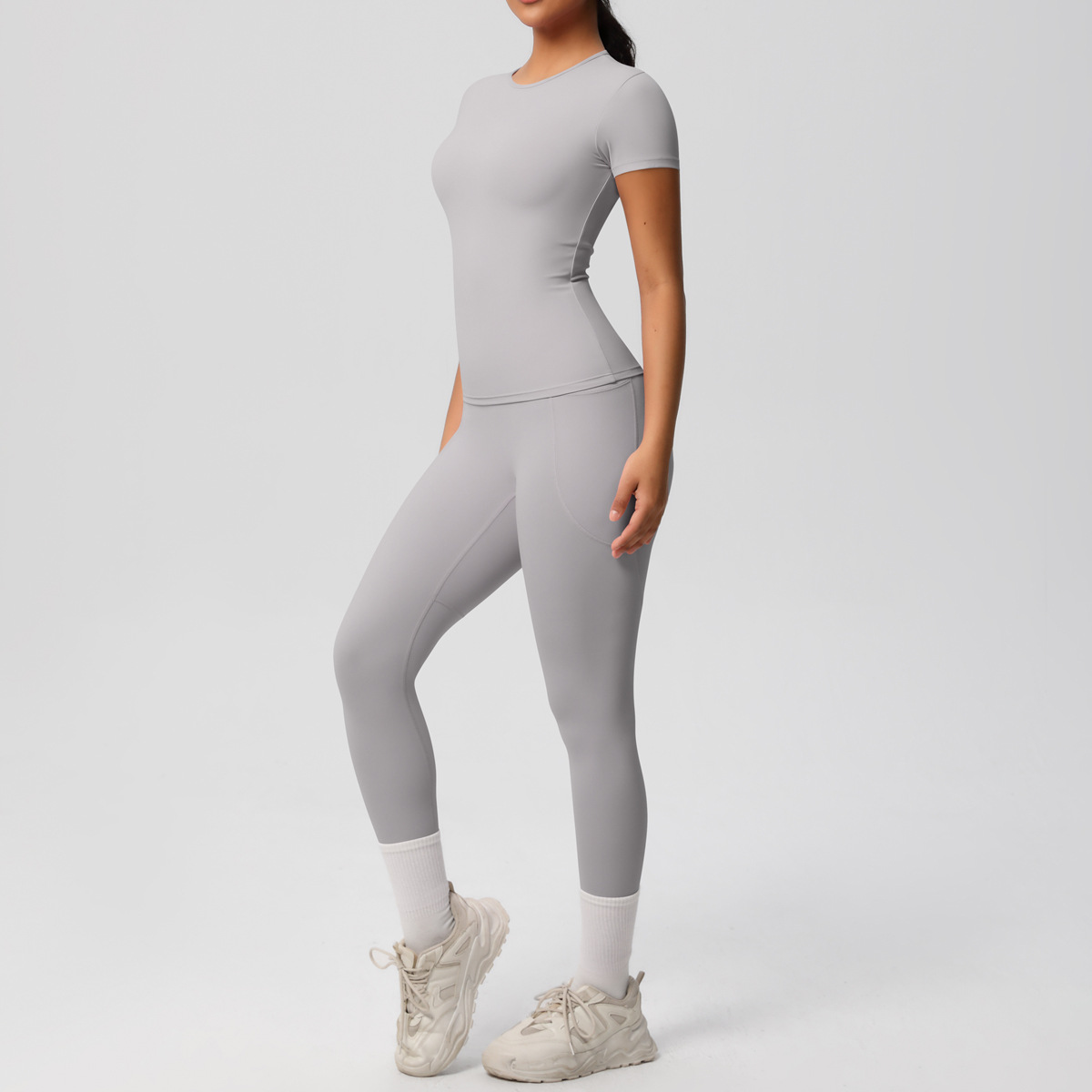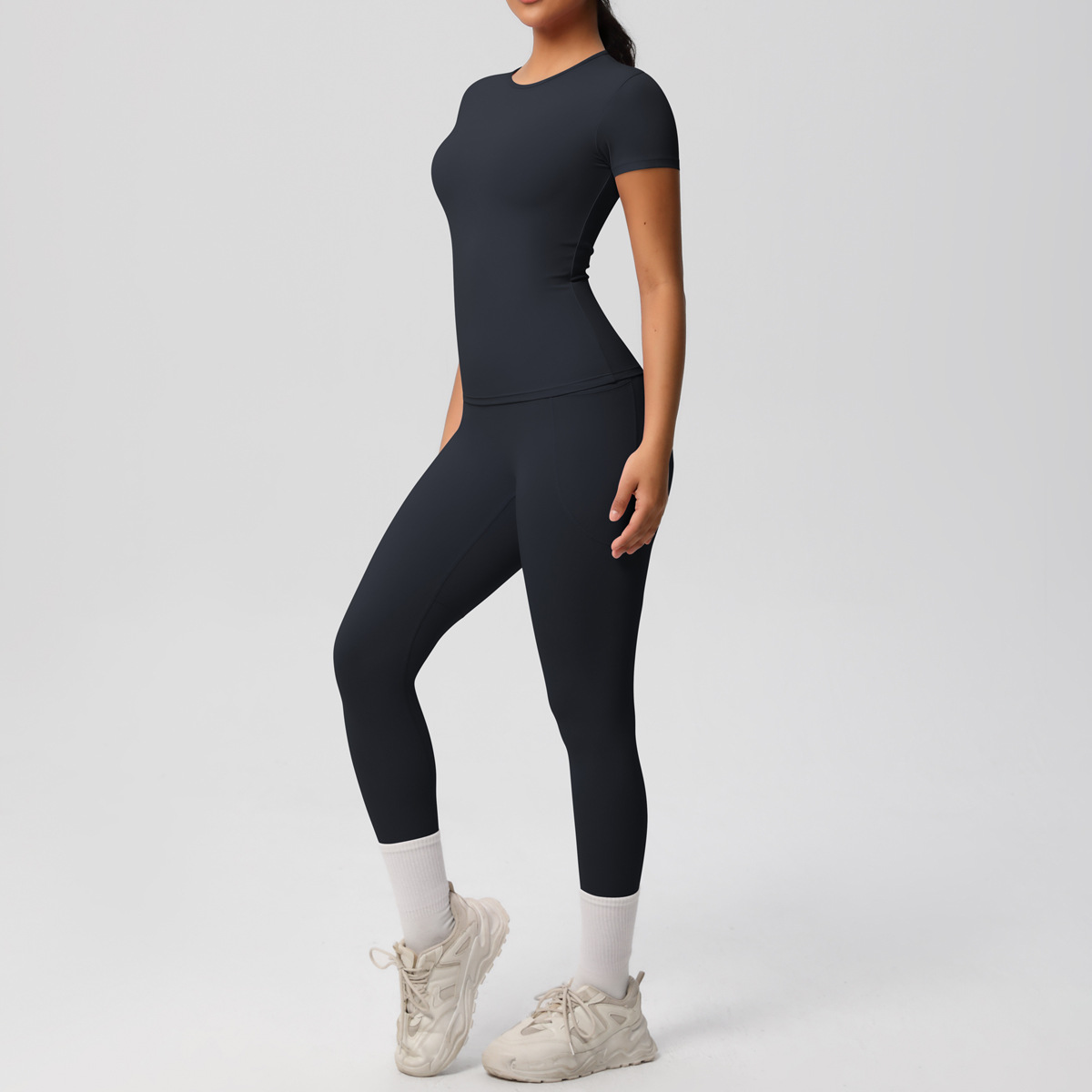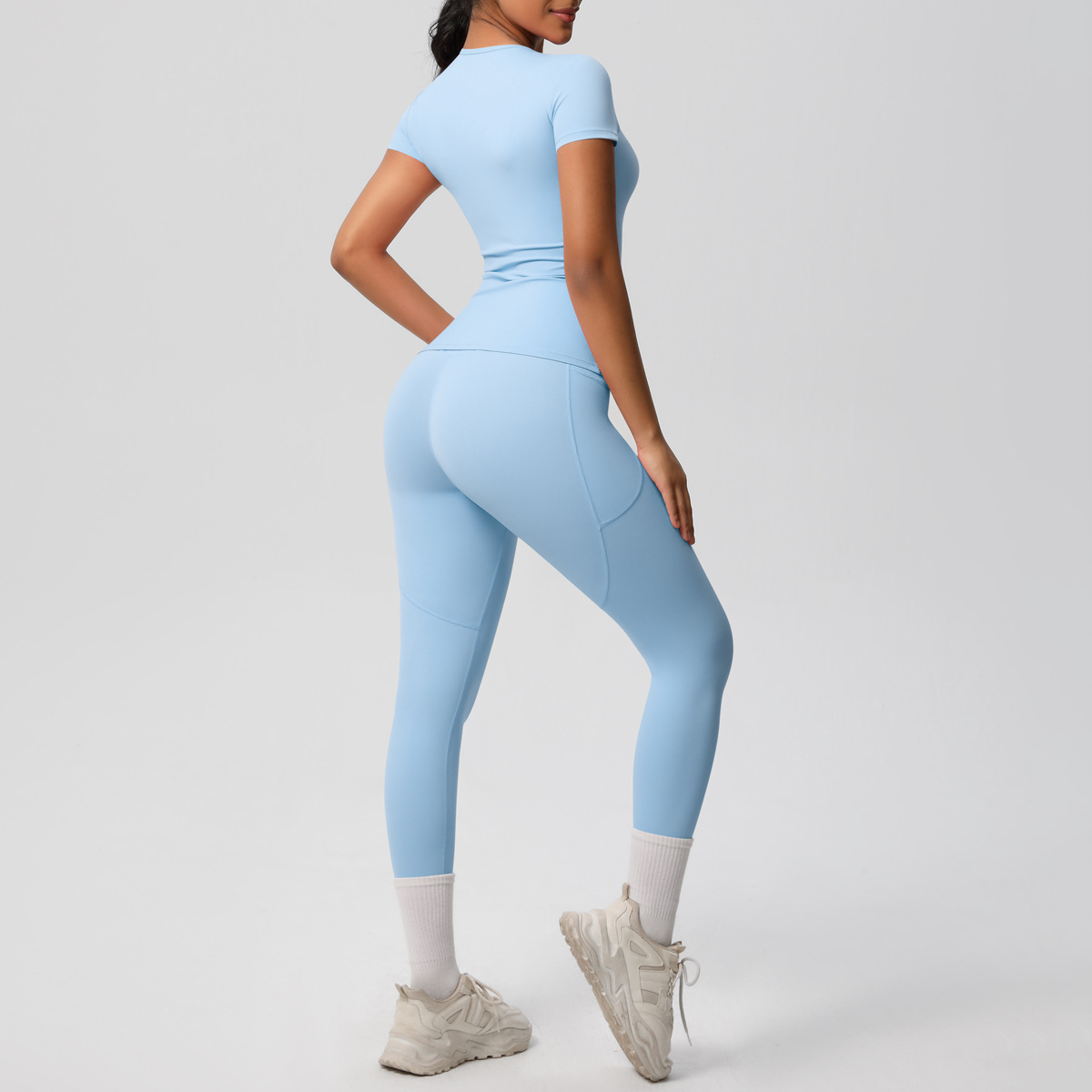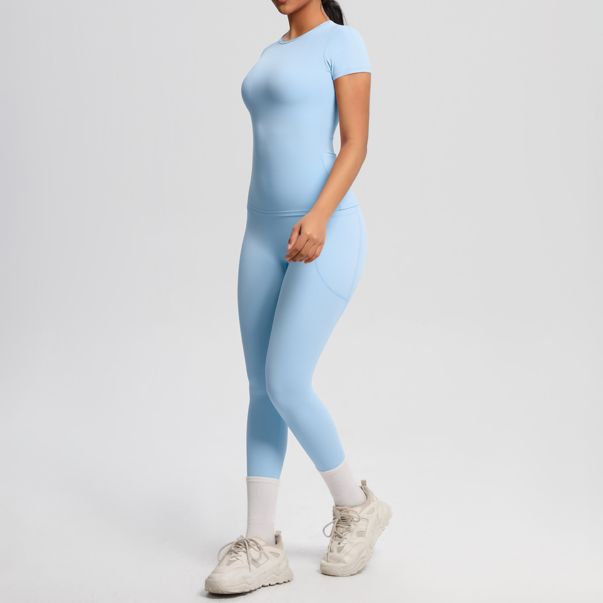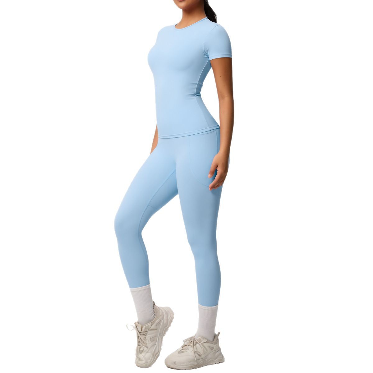 Cross border European and American yoga pocket pants solid color short sleeved skin friendly breathable tight sports short sleeved slimming fitness suit for women