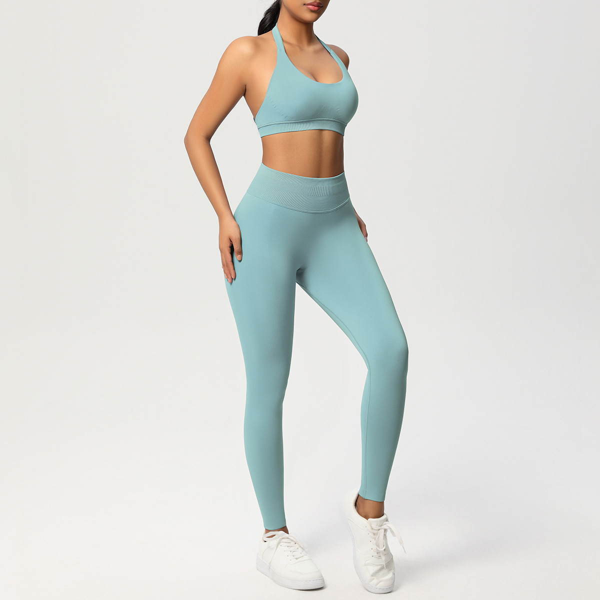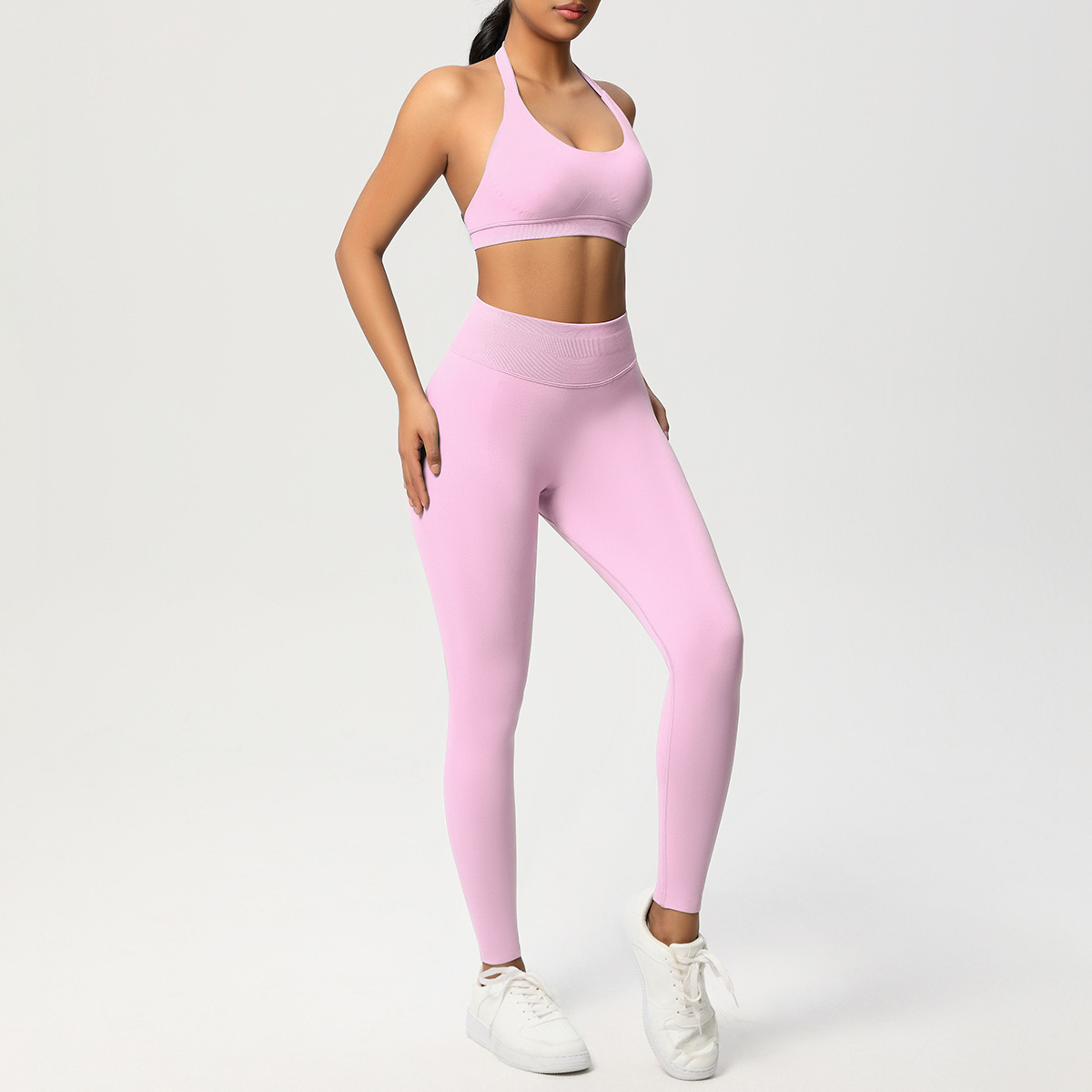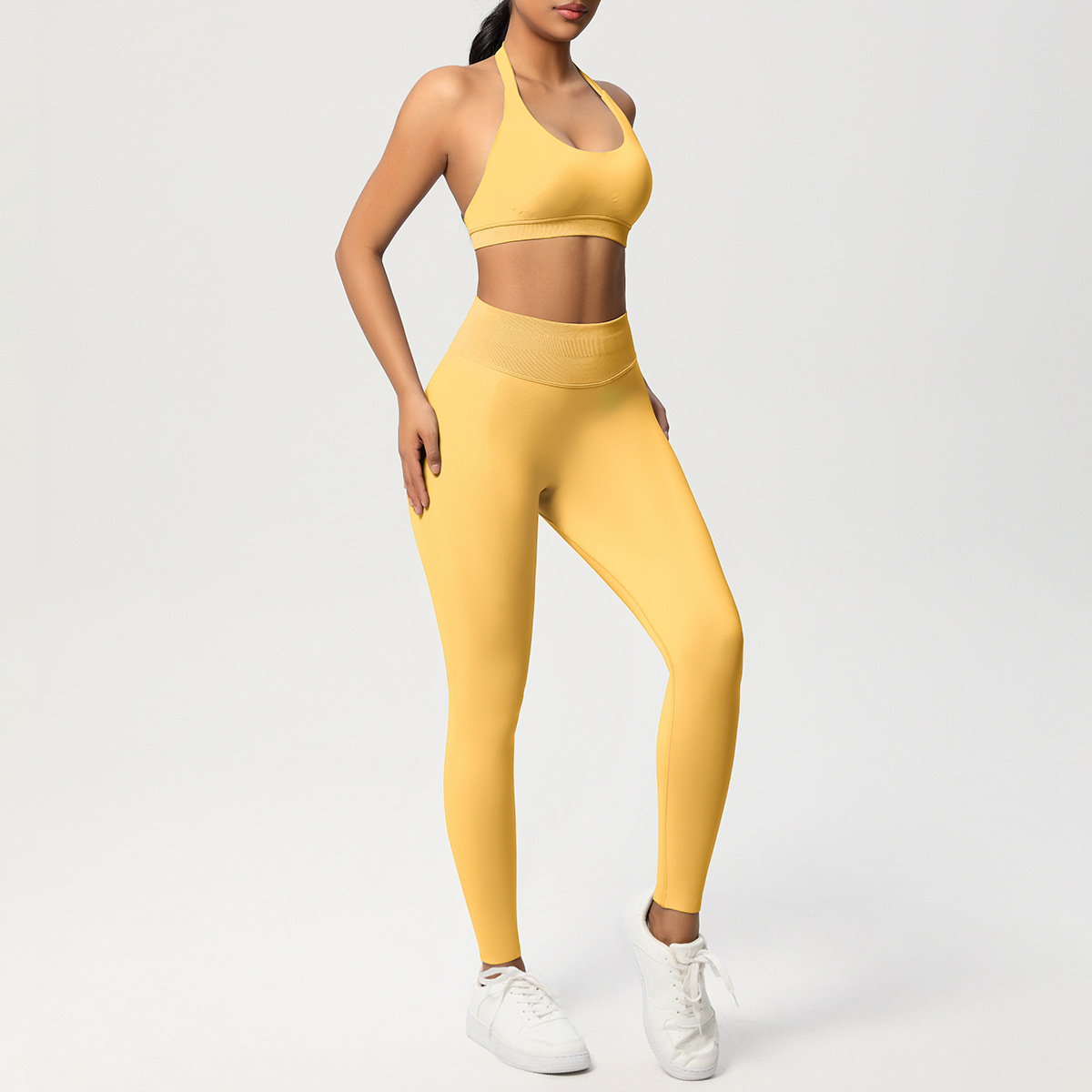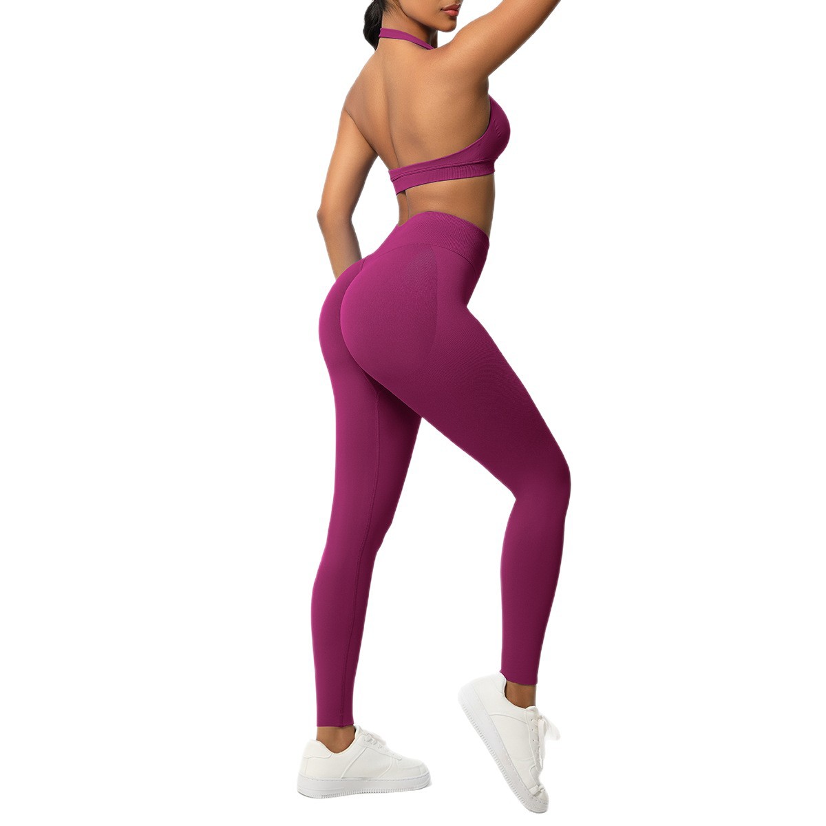 European and American solid color knitted high waisted peach hip yoga pants, sports pants, hanging neck and beautiful back bra, fitness yoga set
