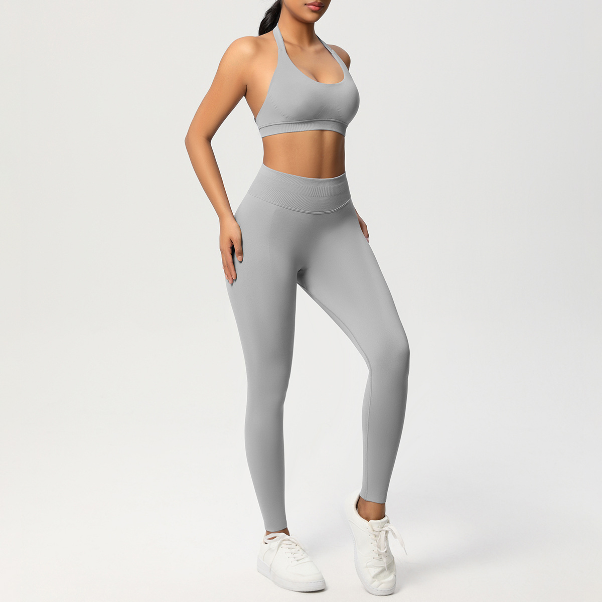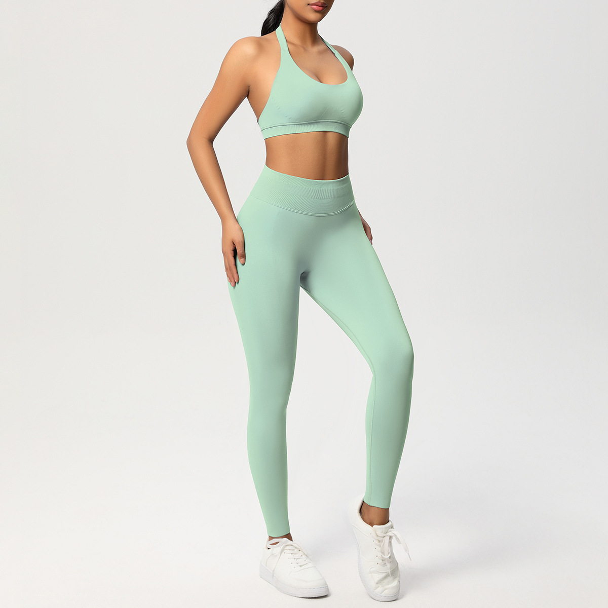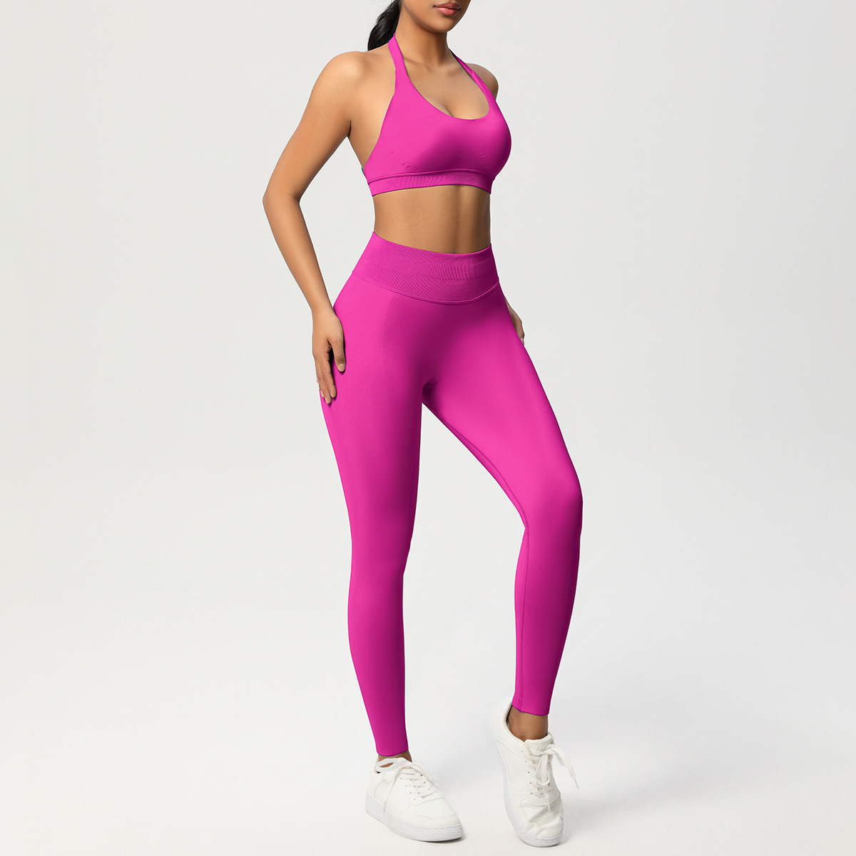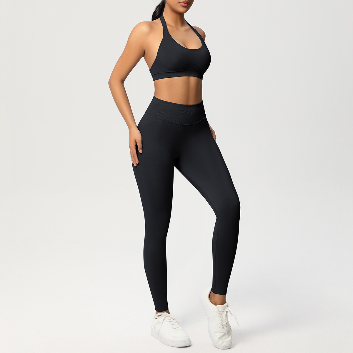 European and American solid color knitted high waisted peach hip yoga pants, sports pants, hanging neck and beautiful back bra, fitness yoga set