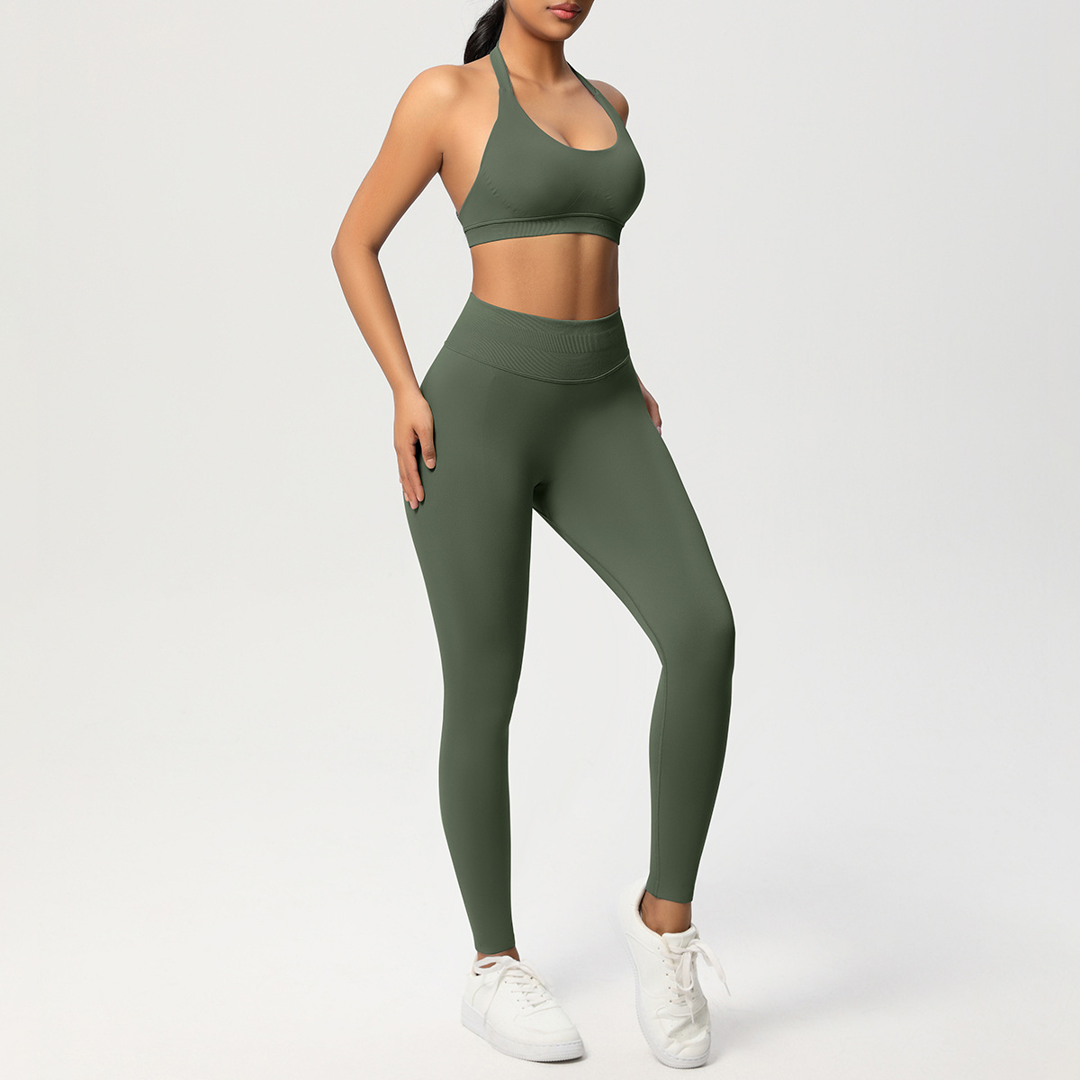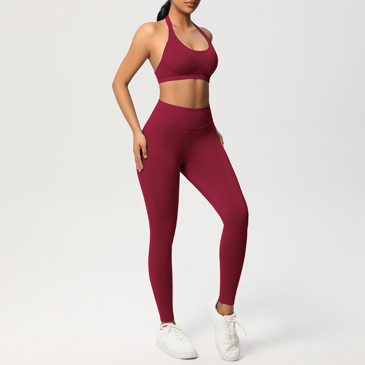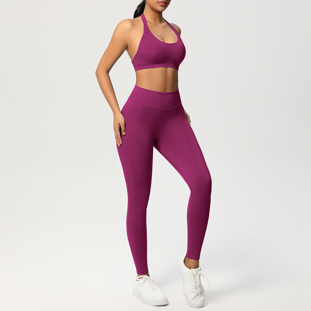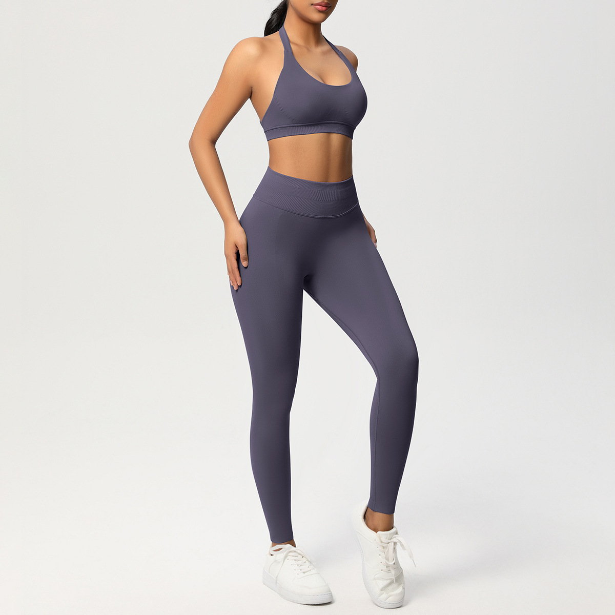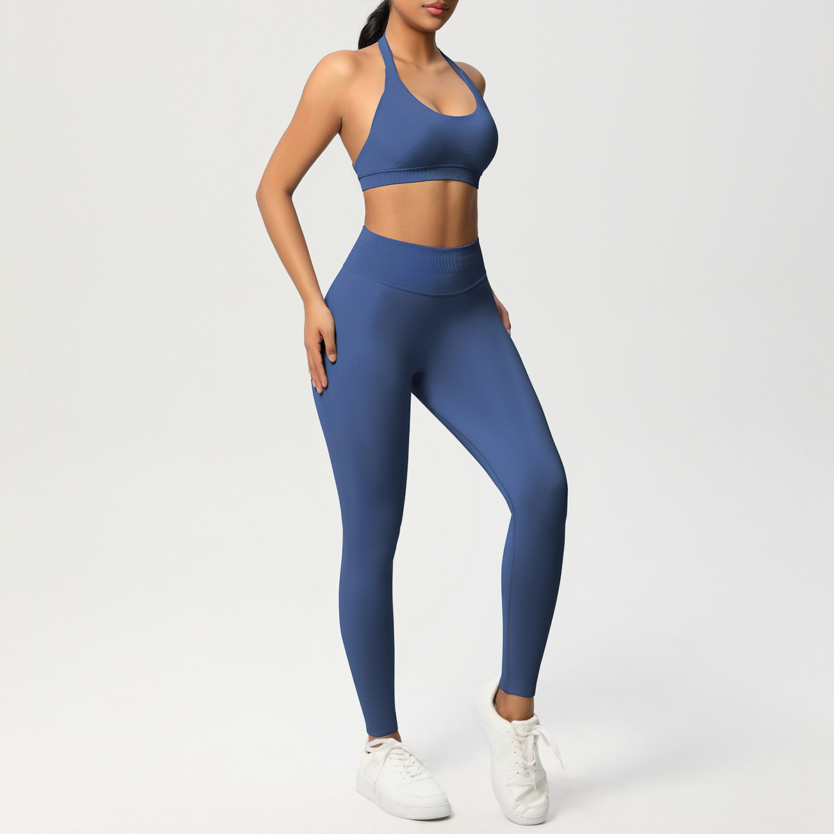 European and American solid color knitted high waisted peach hip yoga pants, sports pants, hanging neck and beautiful back bra, fitness yoga set