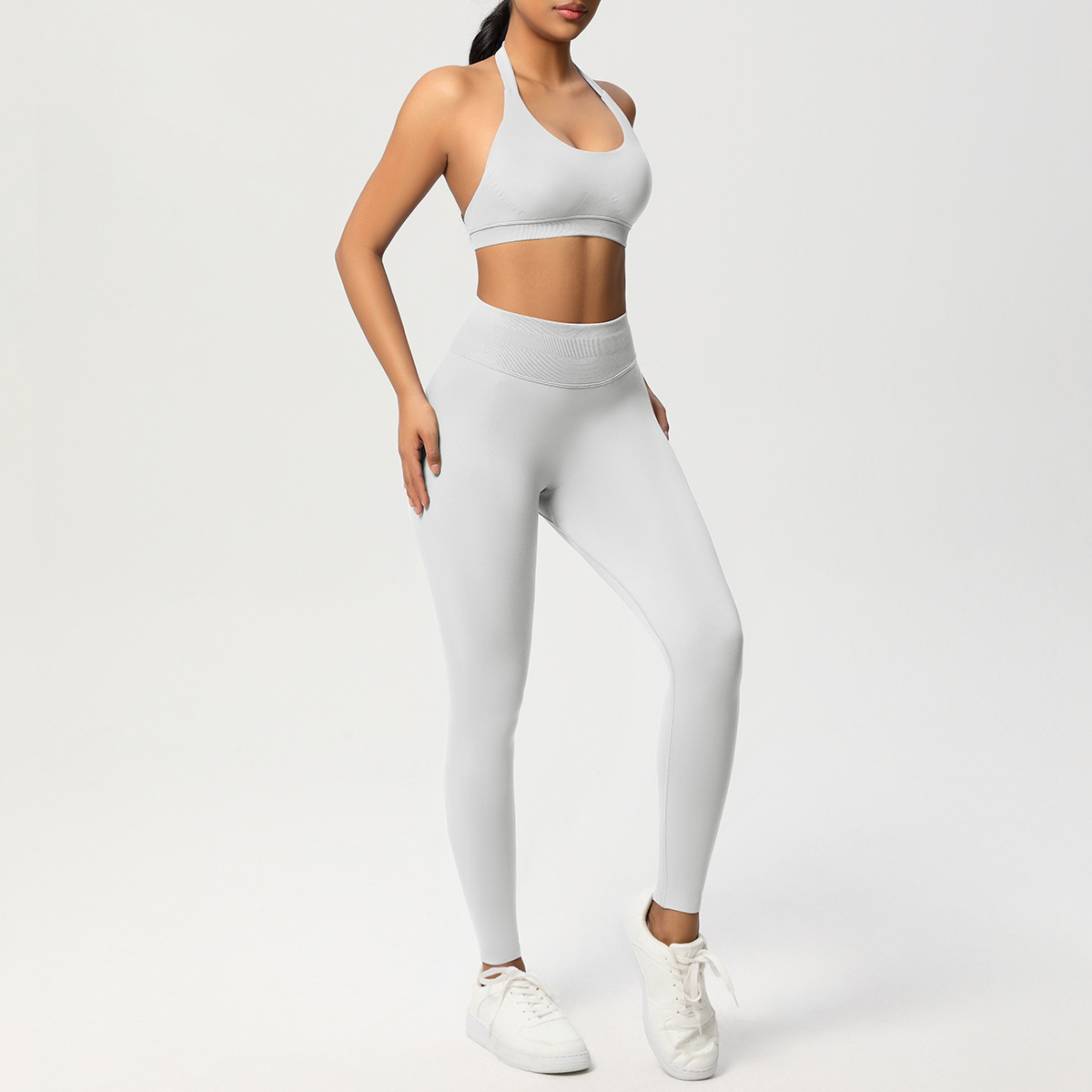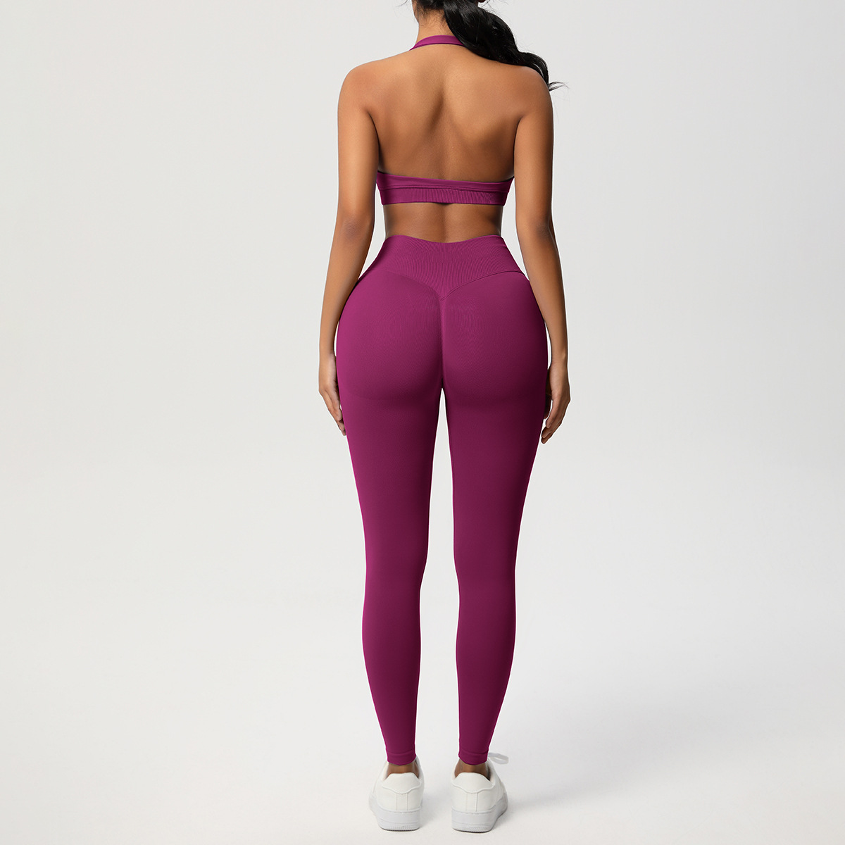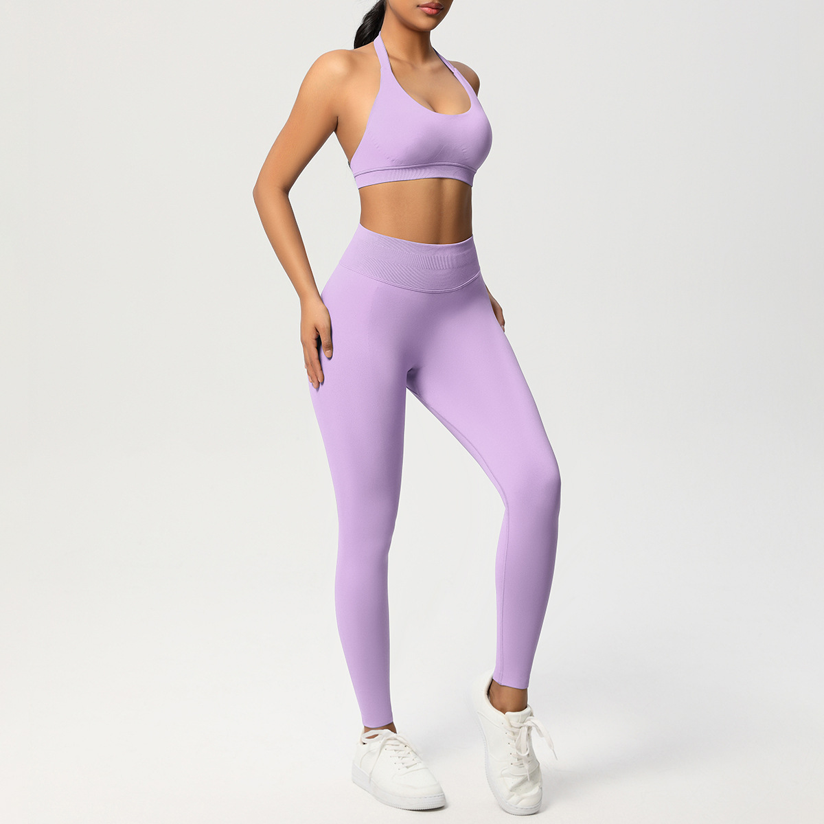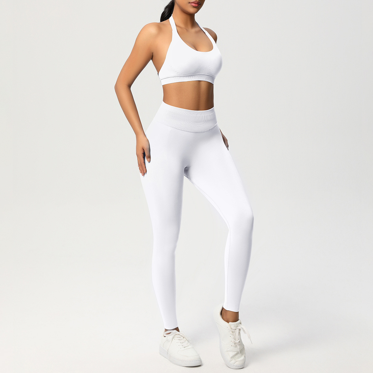 European and American solid color knitted high waisted peach hip yoga pants, sports pants, hanging neck and beautiful back bra, fitness yoga set