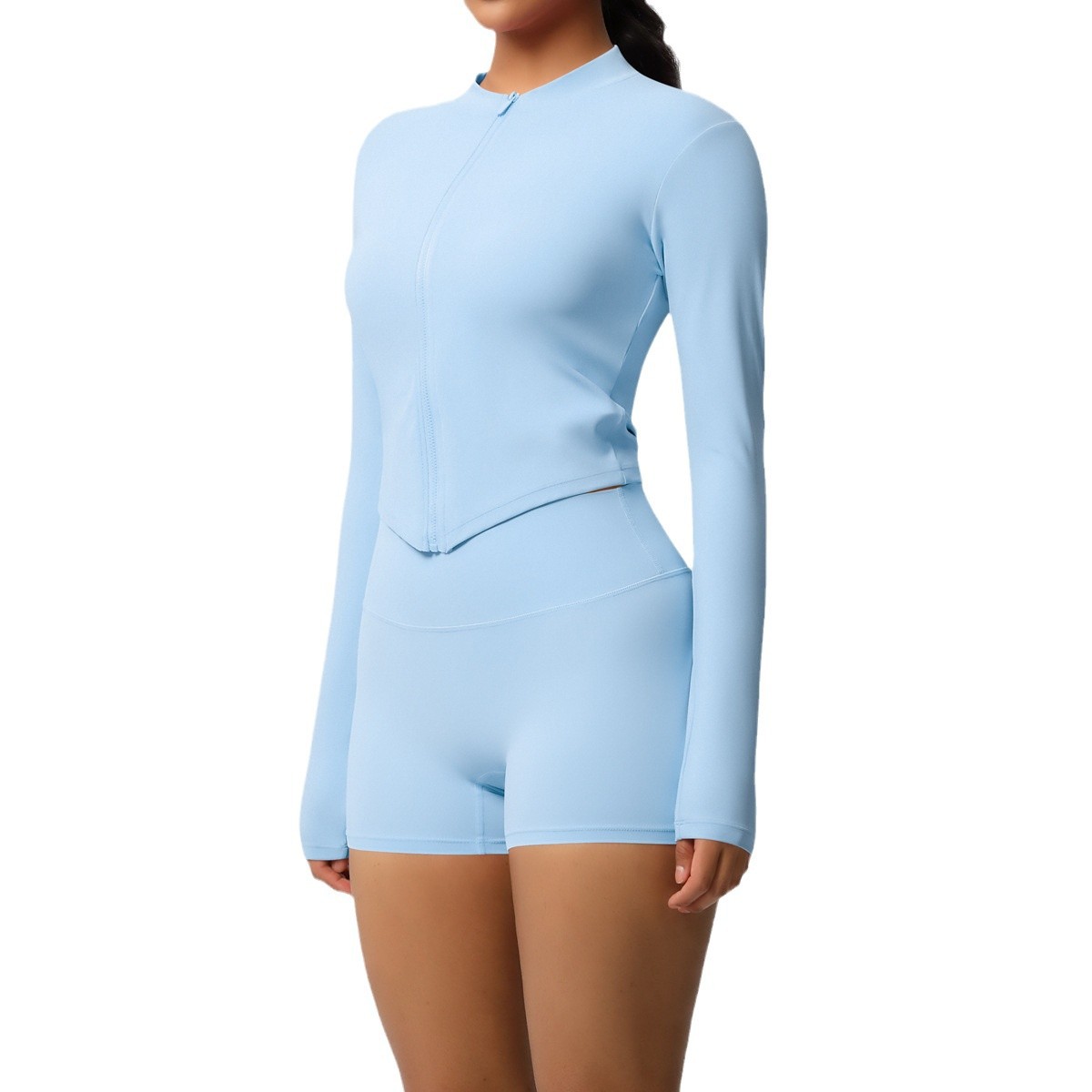Cross border European and American new brushed nude slimming shorts, yoga zipper long sleeved breathable fitness running training set