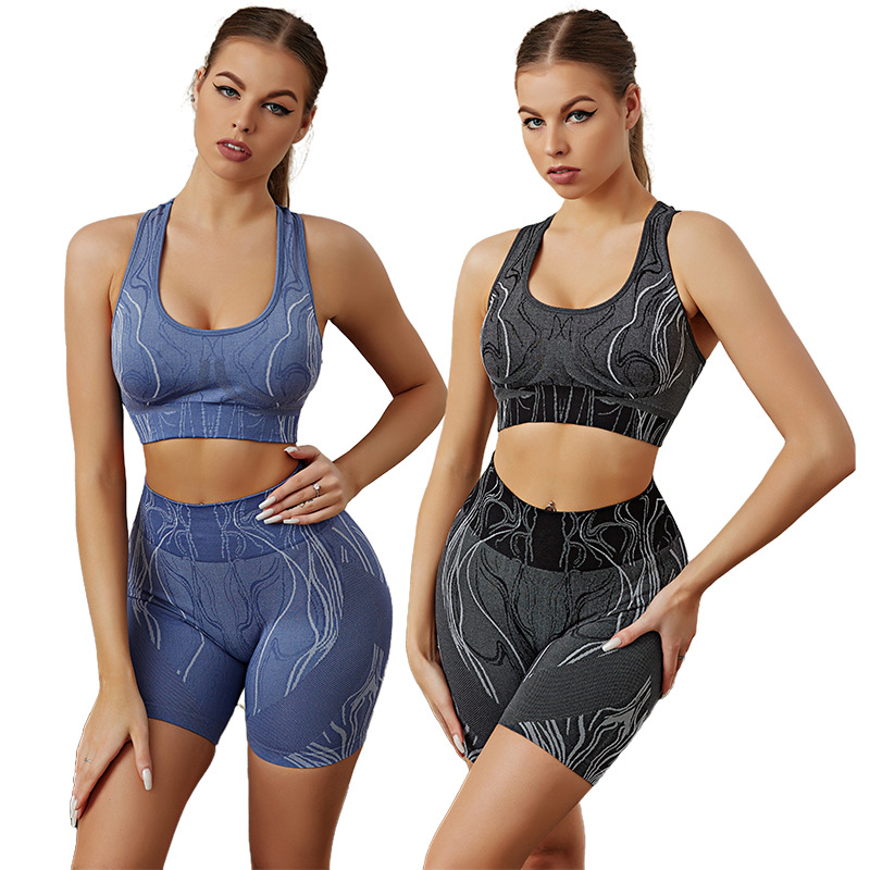 Cross border European and American printed yoga clothes three piece set, hip lifting elastic yoga pants, sports underwear, fitness set, women's tight fitting