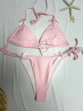 Cross border 2026 European and American solid color women's swimsuit beach sexy bow bikini set BIKINI split