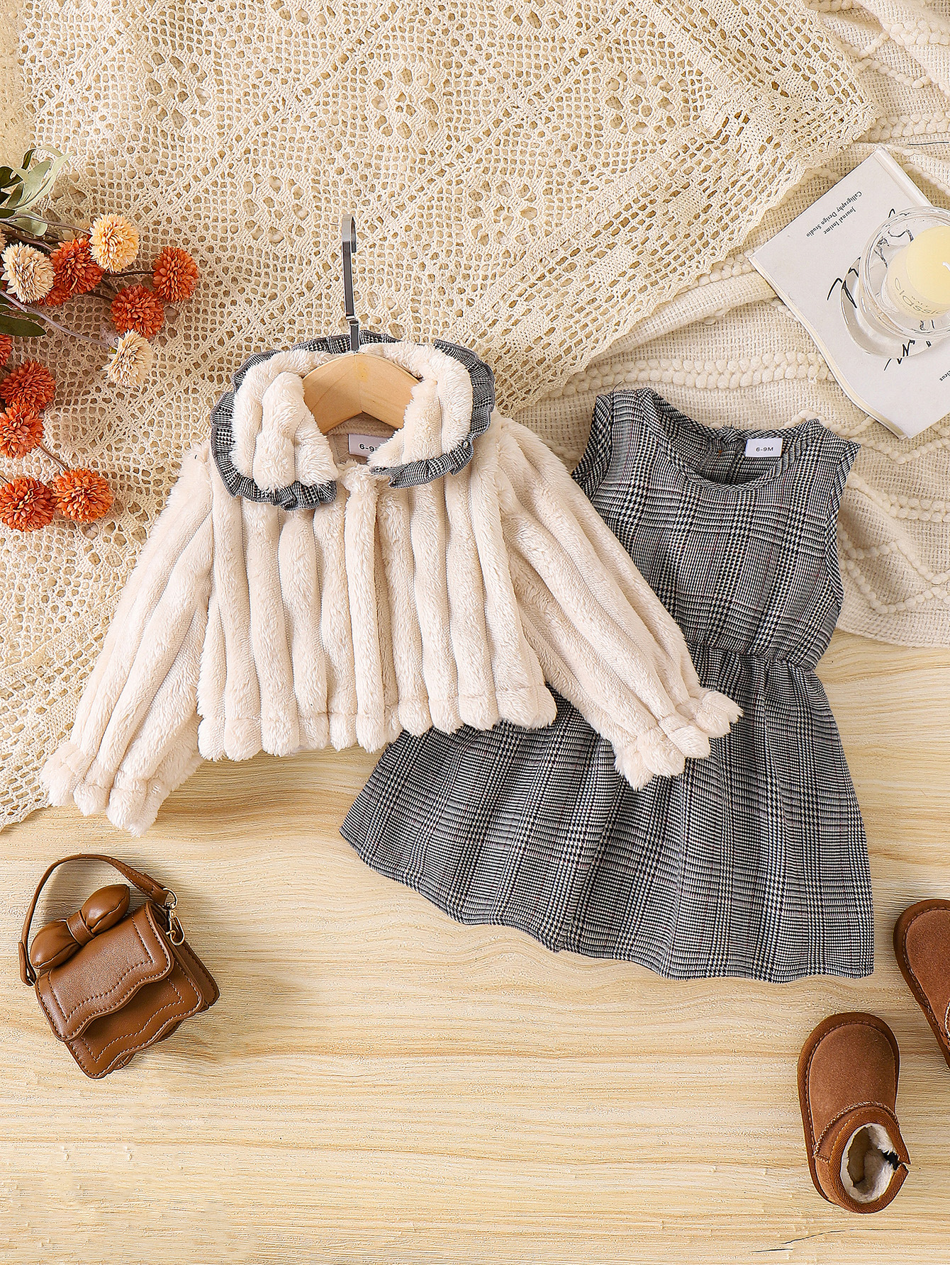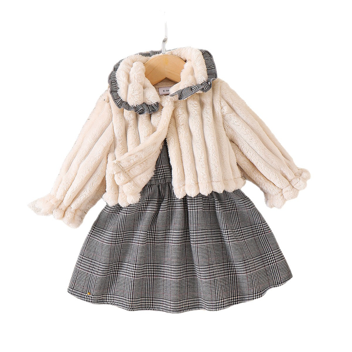 Mi white plush plaid collar cloak jacket, gray plaid sleeveless dress, autumn and winter temperament two-piece set for foreign trade children's clothing
