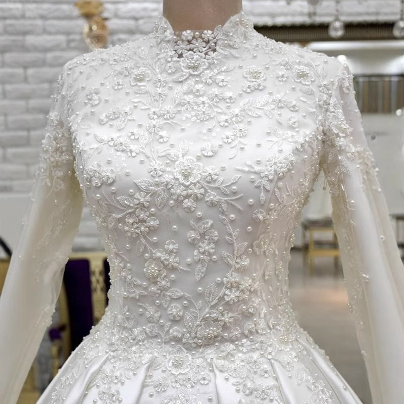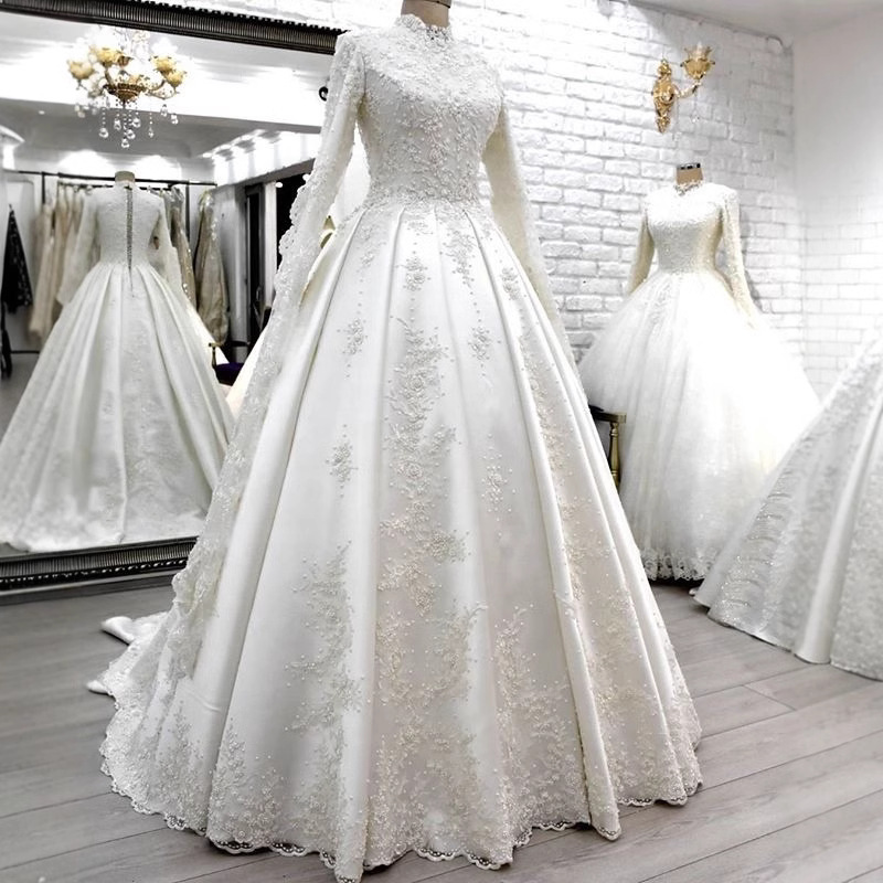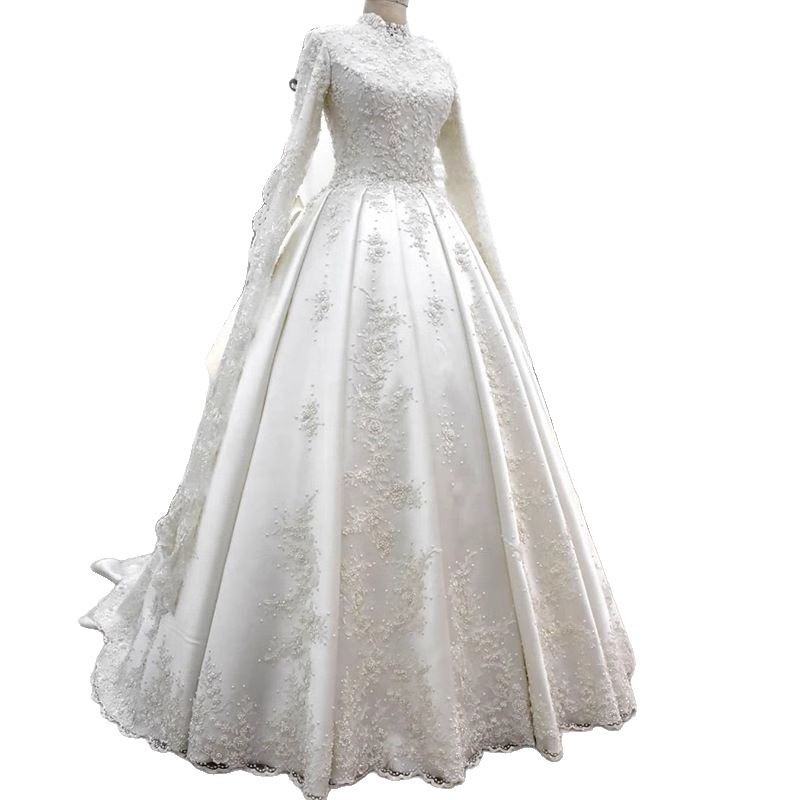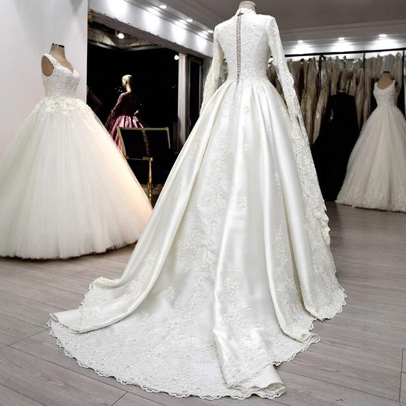 Luxurious Muslim high neck embroidered bead decoration long sleeved satin princess skirt support trailing ethnic clothing wedding dress, wedding dress