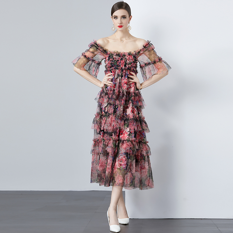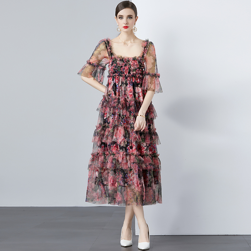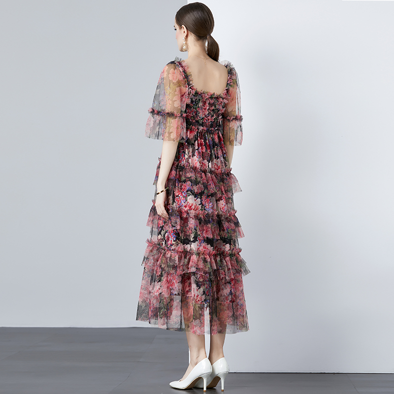 Real shot - Heavy Industry Mesh Printed Cake Skirt with Cuihua Large Ornament Fairy Long Dress