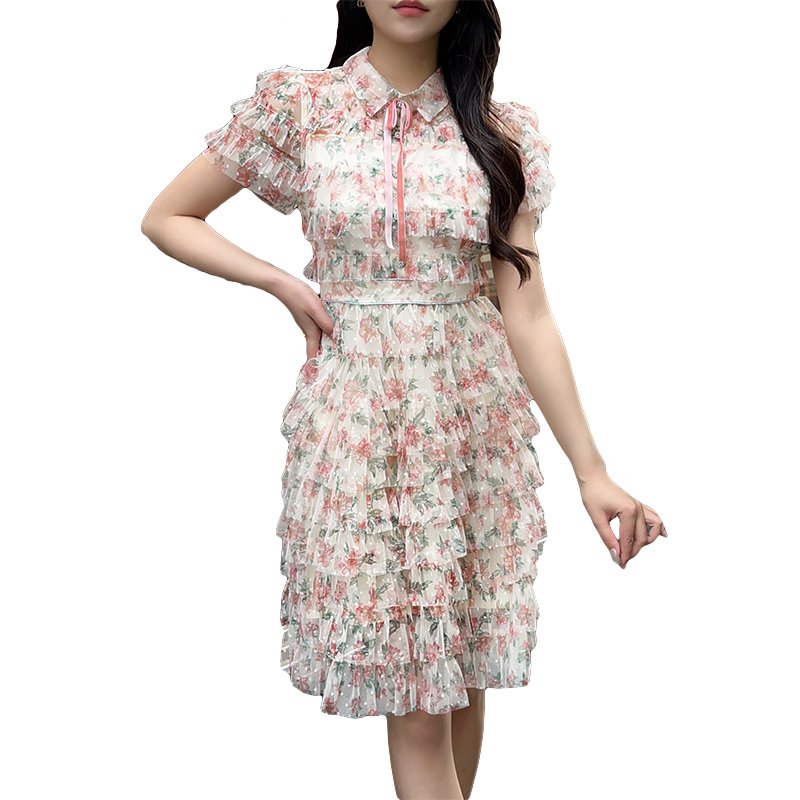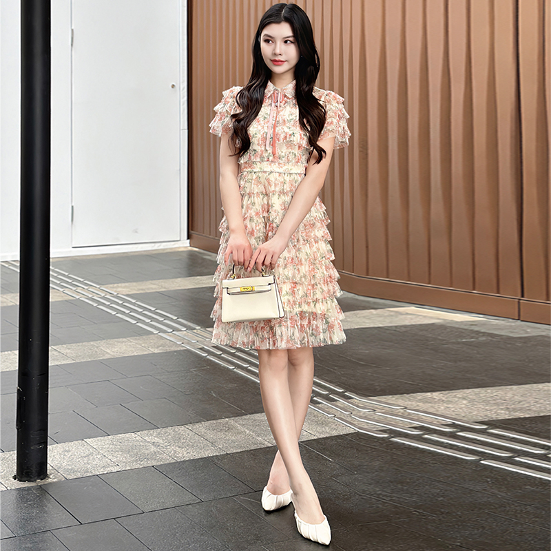 Real shot - Light luxury boutique mesh printed small fragrant style elegant emerald flower cake skirt