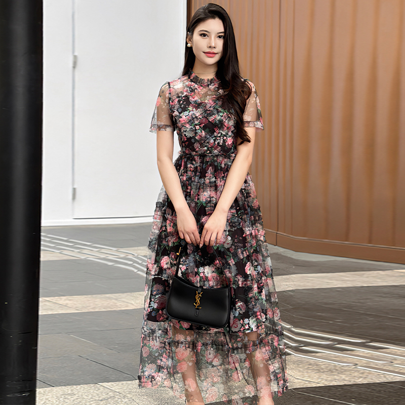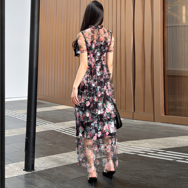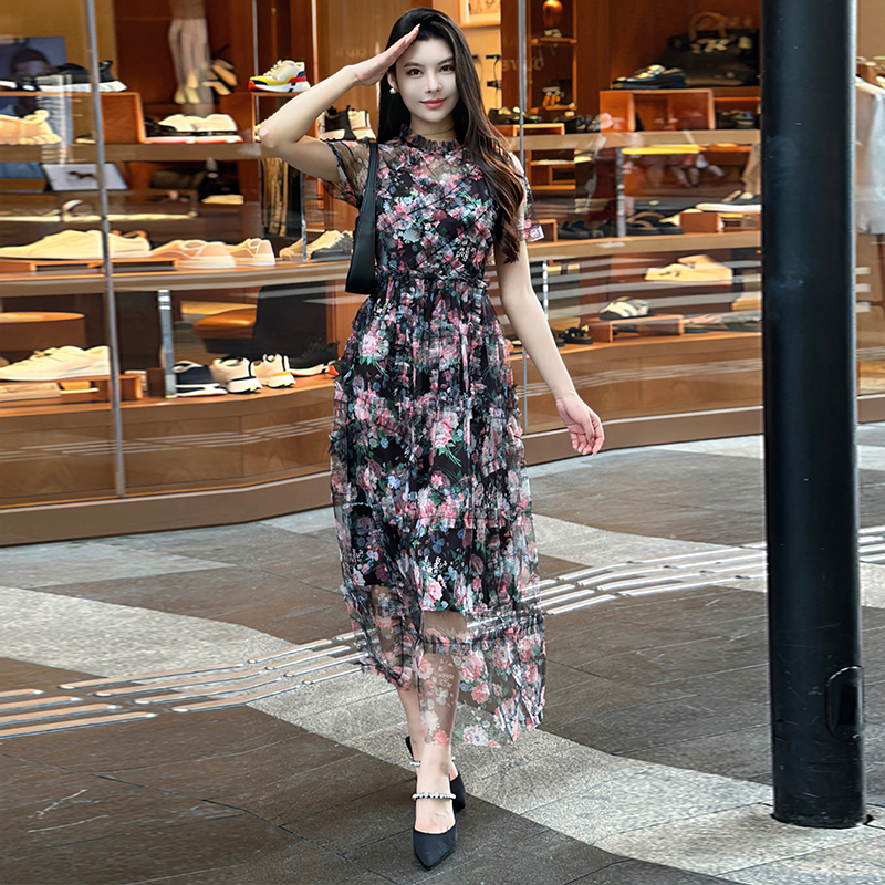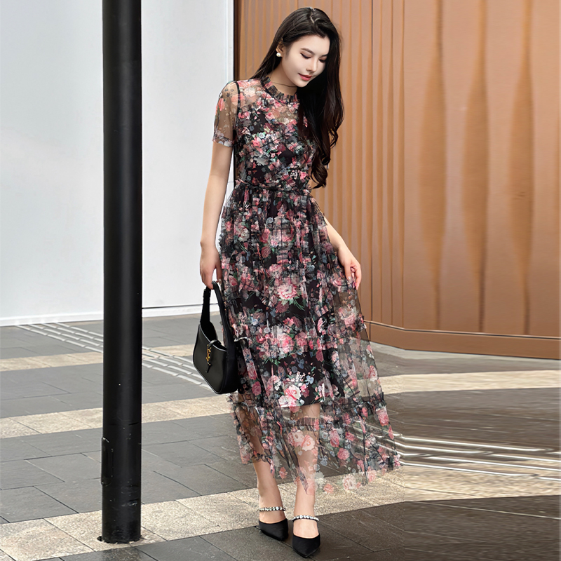 Real shot - Heavy Industry Mesh Double layer Printed Starry Sky Color Fairy Air Drifting Lady Dress