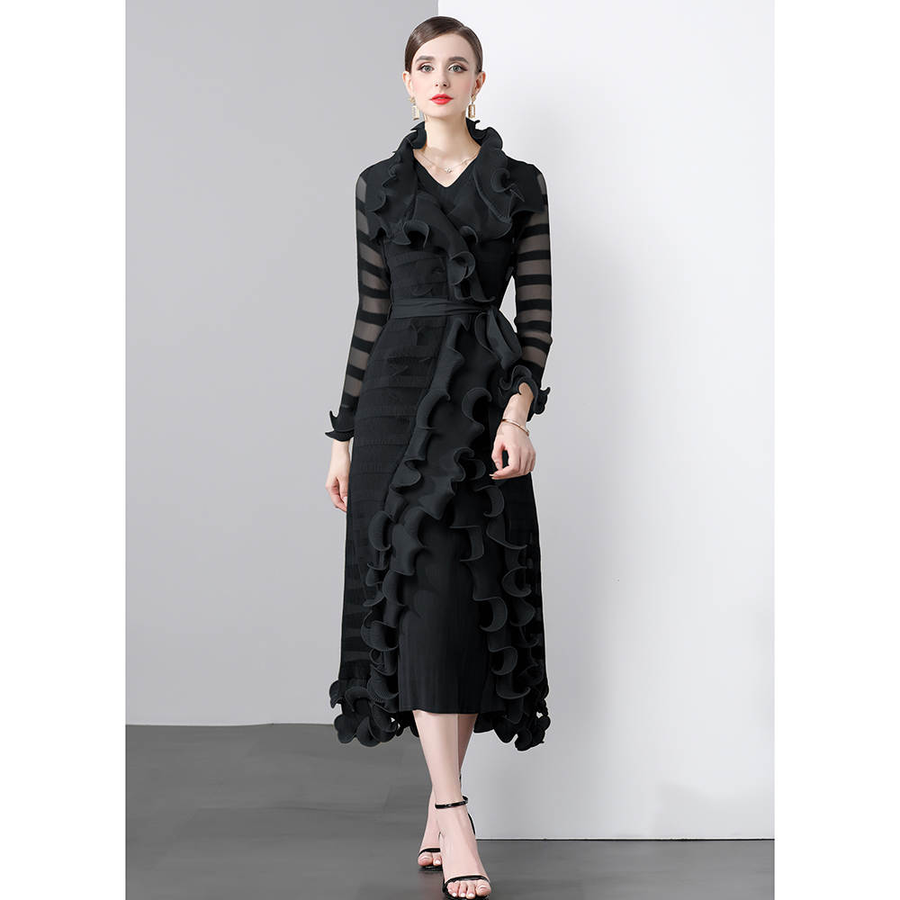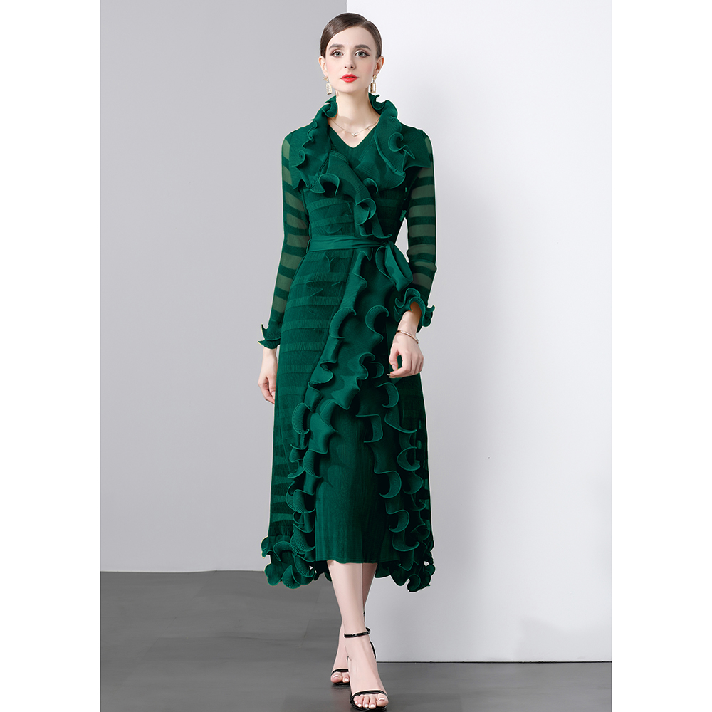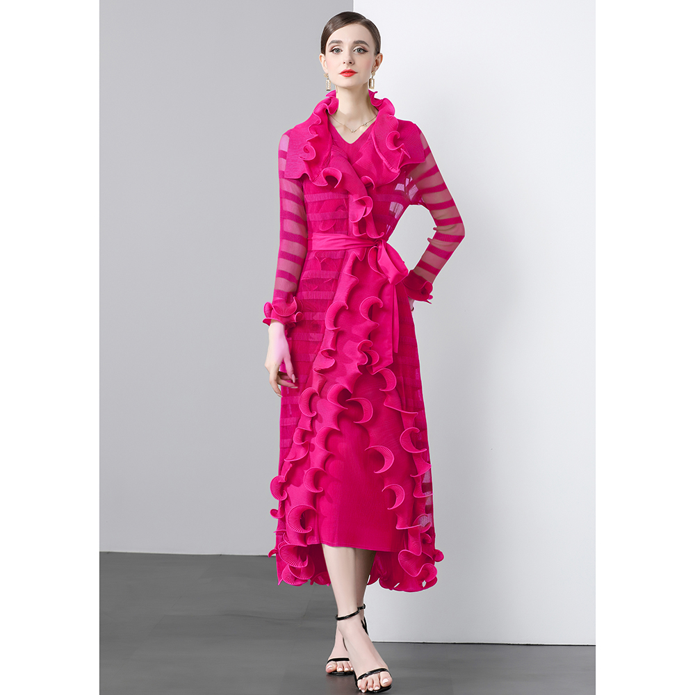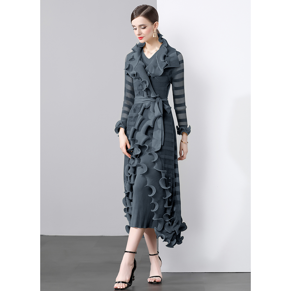 Factory direct sales three fold heavy industry fish silk thread wave edge length jacket+V-neck A-line skirt two-piece set